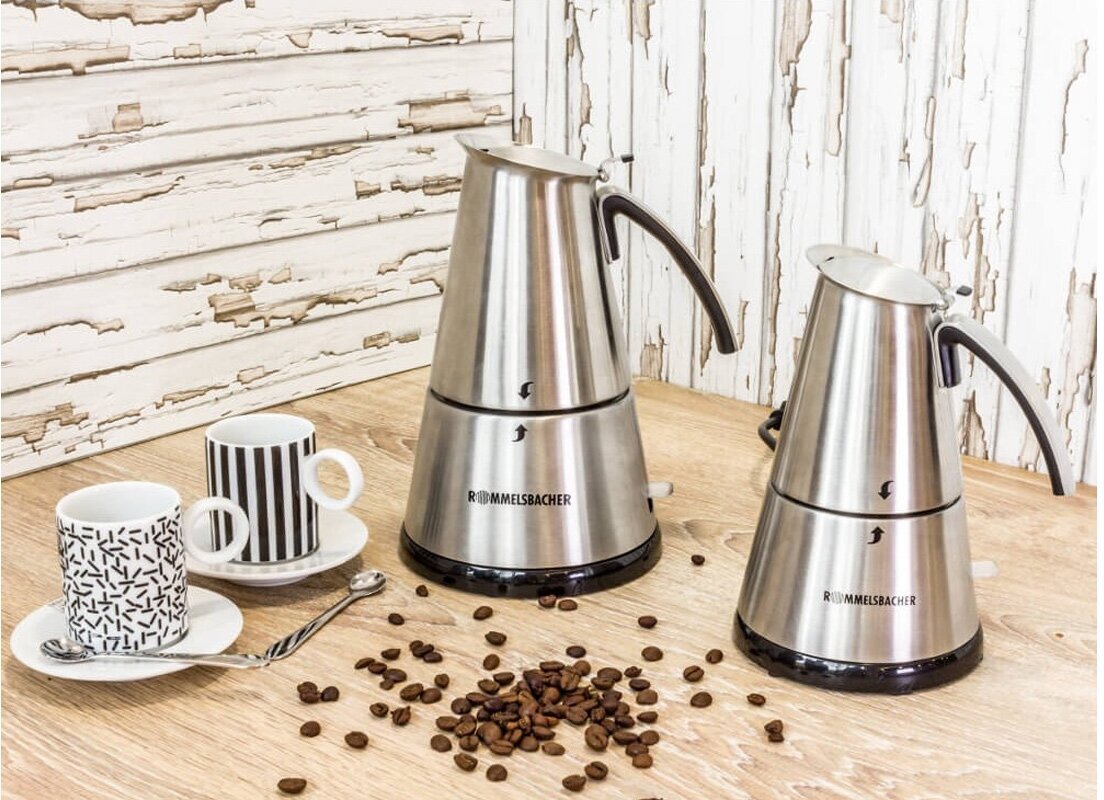 Гейзерная кофеварка Rommelsbacher используется в квартирах, частных домах, кафе и ресторанах. Модель оснащена функцией автоматического отключения, скрытым нагревательным элементом и защитой от перегрева и кипения воды. Корпус и фильтр-вставки выполнены из нержавеющей стали. Прибор имеет cтильный современный дизайн, удобен и прост в использовании. В комплект поставки входят фильтр-вставки на 3 и 6 чашек.