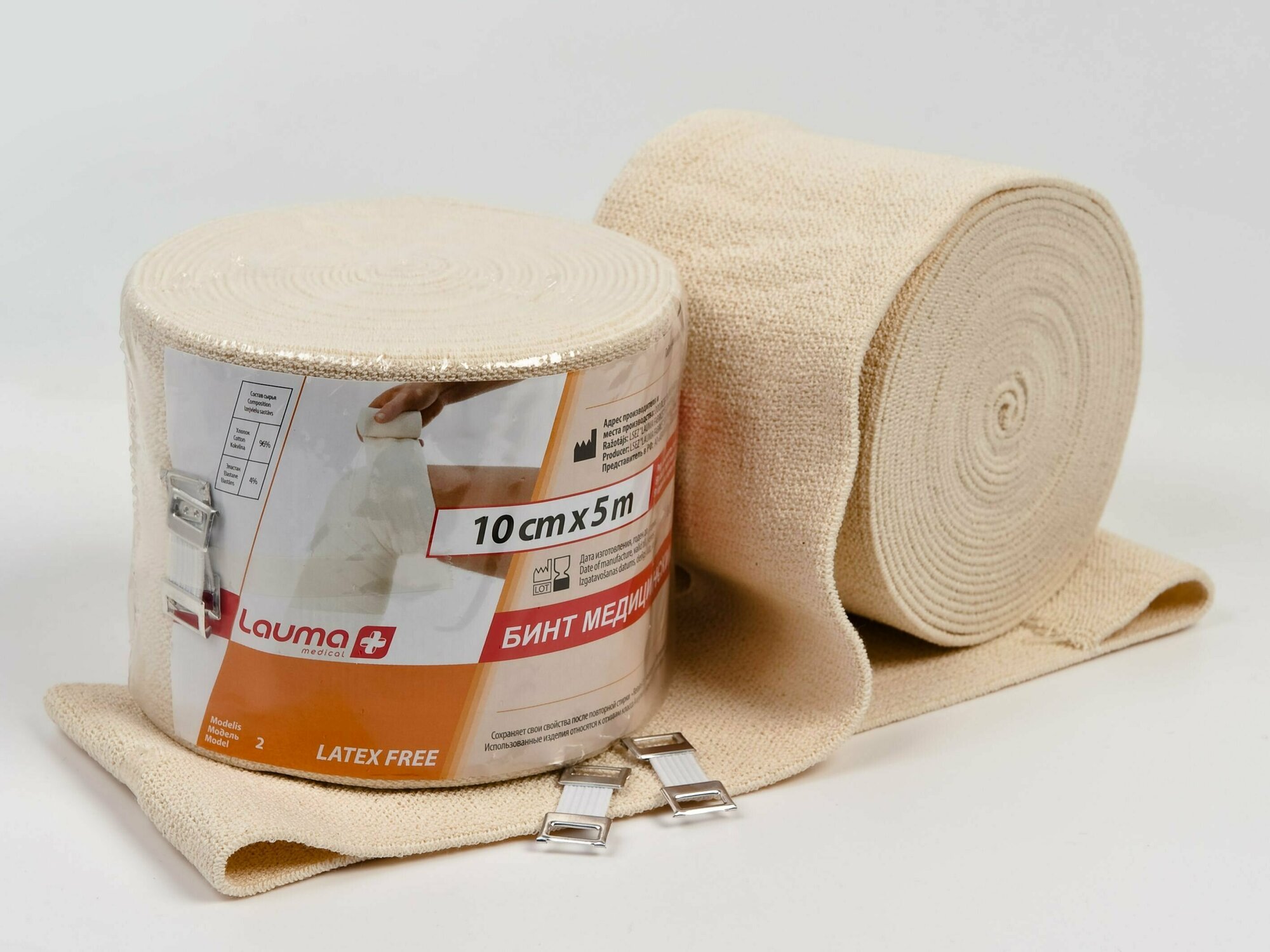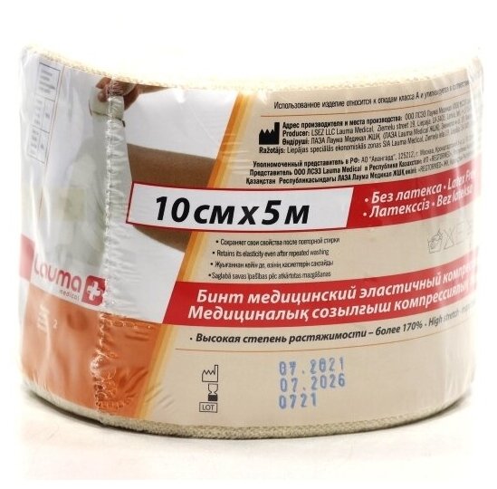 Эластичный компрессионный бинт ЛАУМА (ВЫСОКОЙ РАСТЯЖИМОСТИ) ввиду тканой технологии производства не имеет прямых аналогов и обладает рядом уникальных свойств. Бинт ЛАУМА в растянутом виде сохраняет форму. Не вызывает аллергических раздражений. Позволяет коже дышать. Компрессия сохраняется и при физической нагрузке и при покое. Край бинта не врезается в кожу. Обеспечивает комфорт и удобство. Возможен срез необходимой длины - конец бинта не требует дополнительной обработки. Сохраняет свойства даже при многократной стирке. Металлический фиксатор позволяет удерживать бинт в нужном месте.