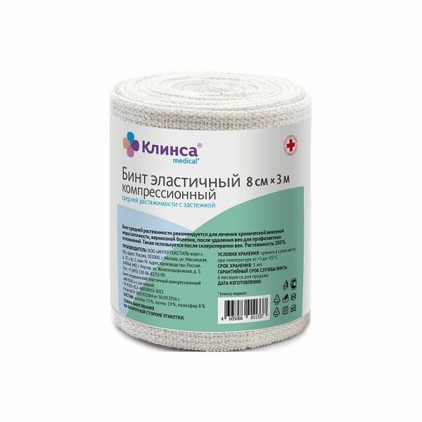 Бинт средней растяжимости рекомендуется при заболеваниях вен нижних конечностей: варикозная болезнь, тромбофлебиты, венозные трофические язвы и т.д., заболеваниях лимфатической системы: лимфатические отеки, состояния после мастэктомии, лимфедема, для фиксации суставов после хирургических манипуляций, профилактики тромбоэмболических осложнений во время операций, родов и при длительном пребывании в стационаре. Использование двойной крученой нити х/б делает бинт тактильно более мягким, менее раздражительным и более прочным при длительном использовании. Хлопок в составе обеспечивает мягкость и воздухопроницаемость. Обработка концов 5-ти ниточным оверлоком способствует более высокой износостойкости, препятствует роспуску бинта после стирок и многократного ношения. Оплетенная латексная нить обеспечивает гипоаллергенность, эластичность и необходимую растяжимость. Полиэфирная нить гарантирует плотность изделия, износостойкость и длительный срок эксплуатации.
