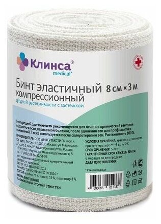 Бинт КЛИНСА Интекс эластичный средней растяжимости с застежкой 300x8 см. Интертекстиль (572839)