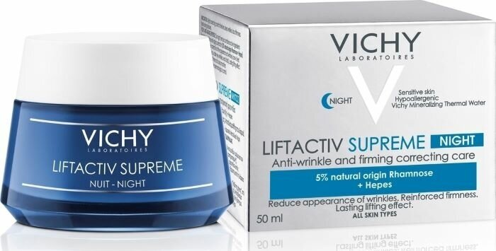 Инновация* от VICHY: Новый ночной крем против морщин для упругости и увлажнения содержит высокую концентрацию чистой гиалуроновой кислоты, 5% рамнозу натурального происхождения и витамин С. Крем мгновенно придает коже упругость и гладкость. Утром лицо выглядит заметно подтянутым и сияющим.