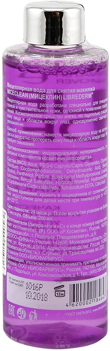 Вода Librederm (Либридерм) Miceclean мицеллярная для снятия макияжа 200 мл Р.Косметик /Дина+ (570844)