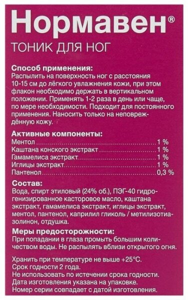 | Способ применения и дозы | Людям от 18 лет. Распылять на поверхность ног с расстояния 10-15 см до легкого увлажнения кожи. Применять 1-2 раза в день или чаще, по мере необходимости. Подходит для постоянного применения. Не оставляет следов на одежде, может наноситься поверх колготок. Только для наружного применения. Не применять на открытых ранах. Не рекомендуется при индивидуальной непереносимости компонентов. Можно использовать в период беременности. |