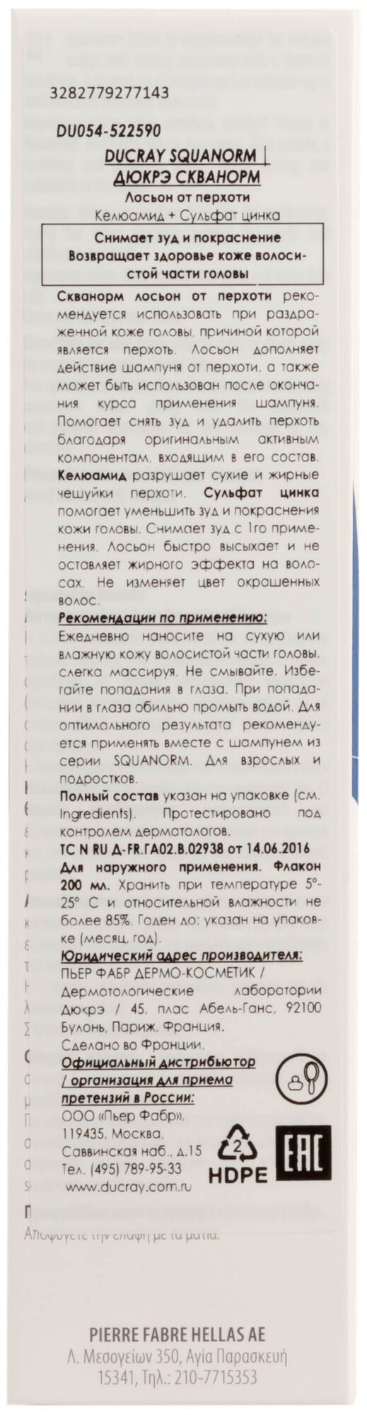 Ducray Squanorm Lotion (Дюкрэ Скванорм Лосьон от перхоти) для жирной, чувствительной кожи. Лосьон от перхоти Ducray Squanorm Lotion, созданный специально для чувствительной кожи головы, моментально устраняет дискомфорт от зуда и жжения, удаляет имеющиеся видимые чешуйки и препятствует появлению новых. Его можно применять в качестве самостоятельного противосеборейного средства и использовать для усиления действия лечебных шампуней. Активные компоненты: келюамид отшелушивает даже самые стойкие чешуйки при сухой и жирной себорее; сульфат цинка проявляет успокаивающие и противовоспалительные свойства, ускоряет регенерацию клеток, повышает кожный иммунитет; лимонная к-та дезинфицирует, увлажняет и смягчает кожу, очищает ее от ороговевших клеток; денатурированный спирт – мощный антисептик и бактериостатик. В интернет-магазине Перфектория Ducray Squanorm лосьон от перхоти и другие товары из каталога можно купить, не выходя из дома, с доставкой в любой населенный пункт РФ и стран СНГ. Цены ниже, чем в обычных аптеках, оформление заказов на сайте – в один клик. На страничках «Акции» и «Скидки» - самые выгодные предложения. Каждому покупателю гарантируем подарки: каталог любимой марки и пробники новинок, количество которых зависит от количества заказанных продуктов. Правильно подобрать косметику по типу кожи поможет бесплатная консультация профессионального косметолога по телефону или в онлайн-чате. Обращайтесь! гипоаллергенно