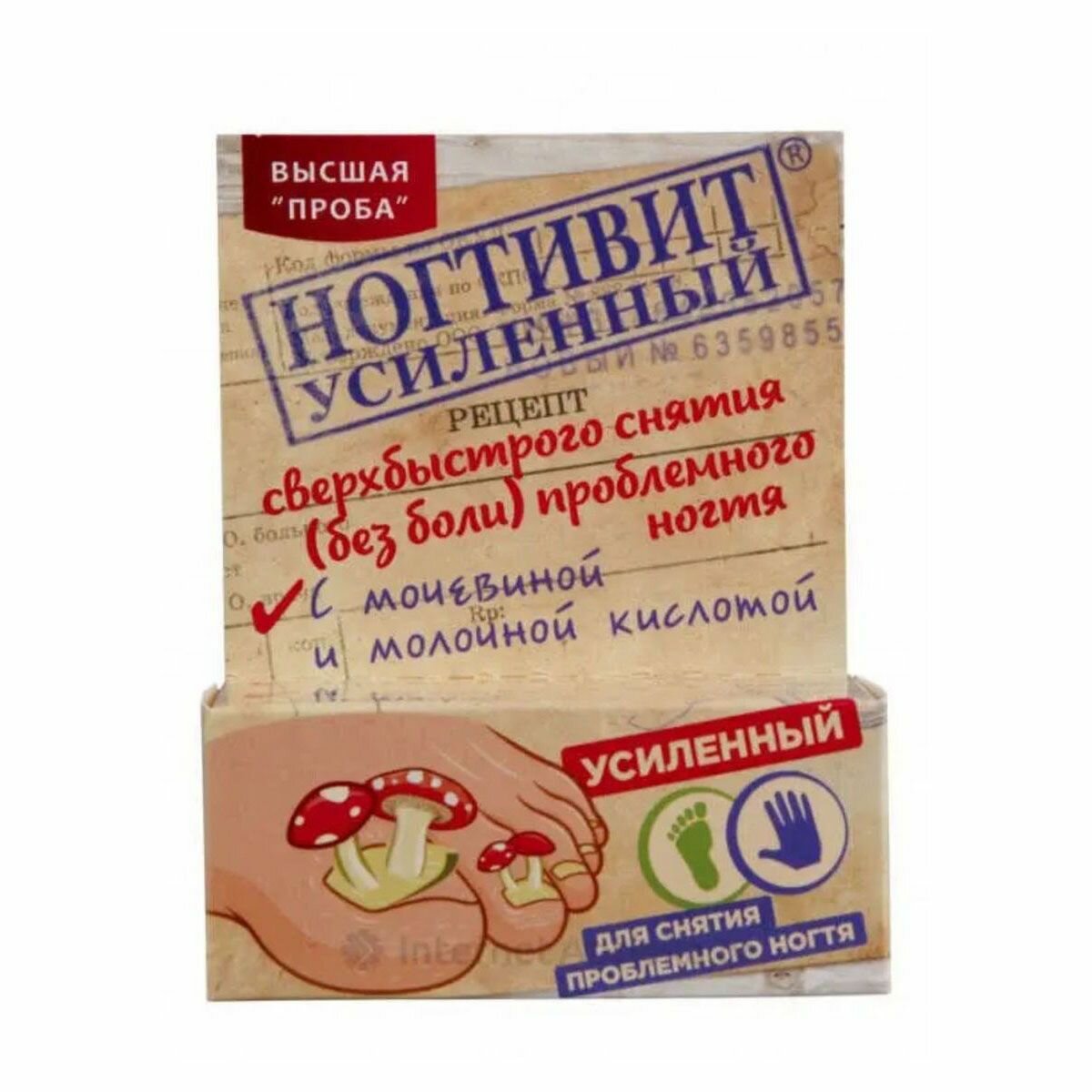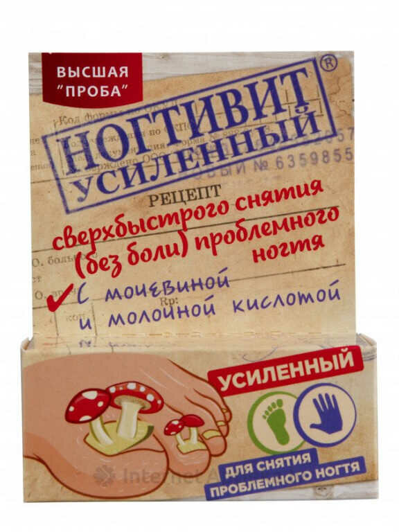 Крем «Ногтивит усиленный» предназначен для безболезненного удаления пораженной ногтевой пластины. Сильнодействующий препарат – отличный помощник в борьбе против различных грибковых заболеваний. Специальная формула гарантирует избавление от недуга и ускоренный рост новой здоровой ткани. Ногтивит Усиленный наружное средство для ускоренного удаления ногтевых пластин пораженных грибком. Усовершенствованный состав. Повышенная концентрация мочевины и молочной кислоты максимально увеличивают действие средства от запущенного грибка ногтей. После обработки кремом «Ногтивит усиленный» ногтевая пластина размягчается, после этого требуется произвести снятие пораженного слоя при помощи маникюрной пилочки. Масло чайного дерева и пчелиный воск подавляют патогенную микрофлору и способствуют регенерации клеток. При этом, крем оказывает щадящее влияние на здоровые ткани, не повреждая их. Крем не токсичен и не вызывает побочных явлений. Кроме того, препарат помогает предотвратить врастание ногтя. (При проблеме вросшей ногтевой пластины используйте бальзам «ногтинорм»). Инструкция средства ногтивит усиленный:Сделать размягчающую ванночку для ног. Глубина погружения ноги: вся стопа, голеностопный сустав и 10 см. голени. Для размягчения использовать пищевую соду из расчета: на 1л. воды 1 ст. ложка соды. Продолжительность ванны 25 мин. Температура воды 35-36 градусов. Протереть и высушить пальцы. Закрыть мягкие ткани вокруг пораженных ногтей. Лучше использовать катушечный пластырь на тканевой основе шириной 2.5 см. Пористая структура такого пластыря отлично пропускает воздух и влагу и не вызывает раздражение кожи. Такая процедура необходима, чтобы защитить мягкие ткани от агрессивного воздействия крема. т. к его действие размягчать ногтевую пластину! Нанести крем ногтивит усиленный на пораженные грибком ногти толстым слоем, не втирая. Закрыть ноготь пластырем на 10-12 часов (лучше на ночь), надеть носки без тугих резинок. Утром снять пластырь, и с помощью пилочки для ногтей очистить размягченную часть ногтевой пластины. Процедуру выполнять ежедневно до полного очищения ногтевого ложа от ногтевой пластины. Обычно это 8-10 дней. Следующий обязательный этап, это применение крема подноготный, который ускоряет рост ногтевой пластины, оказывает местное дезинфицирующее действие и обеспечивает рост здоровых ногтей. С момента начала использования крема ногтивит усиленный необходимо заменить носки, колготы, домашнюю обувь. Необходимое количество на курс: При поражении 1 ногтей необходимо: 1 упаковка Ногтивит + 1 упаковка Подноготный При поражении 5 ногтей необходимо: 1 упаковка Ногтивит + 3 упаковки Подноготный ногтивит усиленный + подноготный — комплекс для снятия и восстановления ногтя, пораженного грибком. Деионизированная вода, мочевина, глицерин стеарат, цетеарет-20, цетеарет-12, цетилпальмитат, молочная.