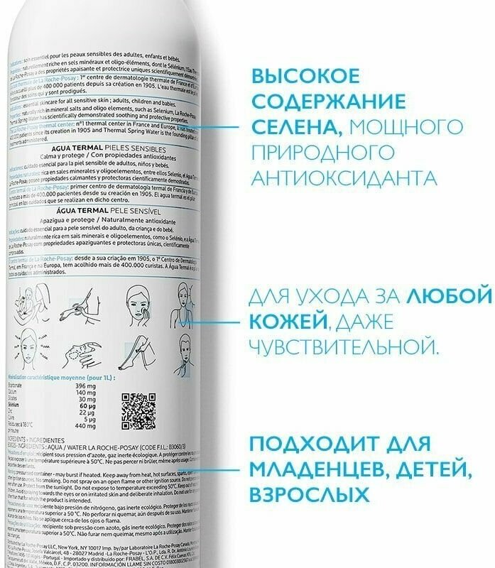 | Применение | распылить Термальную воду на лицо или тело и оставить на 2-3 минуты для впитывания. Аккуратно убрать остатки воды, промокнув салфеткой. Использовать так часто, как это необходимо для ухода за любой кожей, даже самой чувствительной. Может использоваться взрослыми и детьми и применяться в дополнение к дерматологическому лечению. |