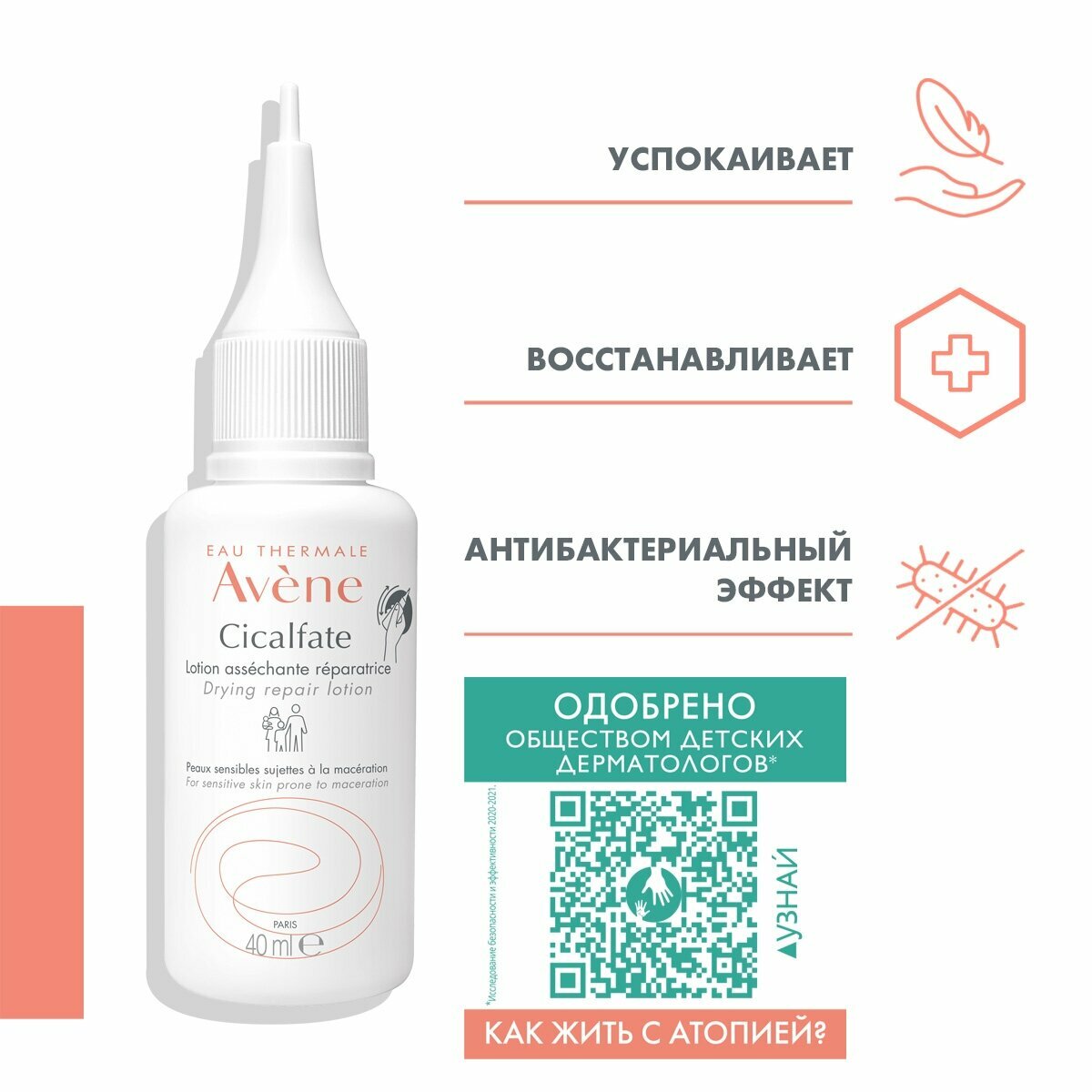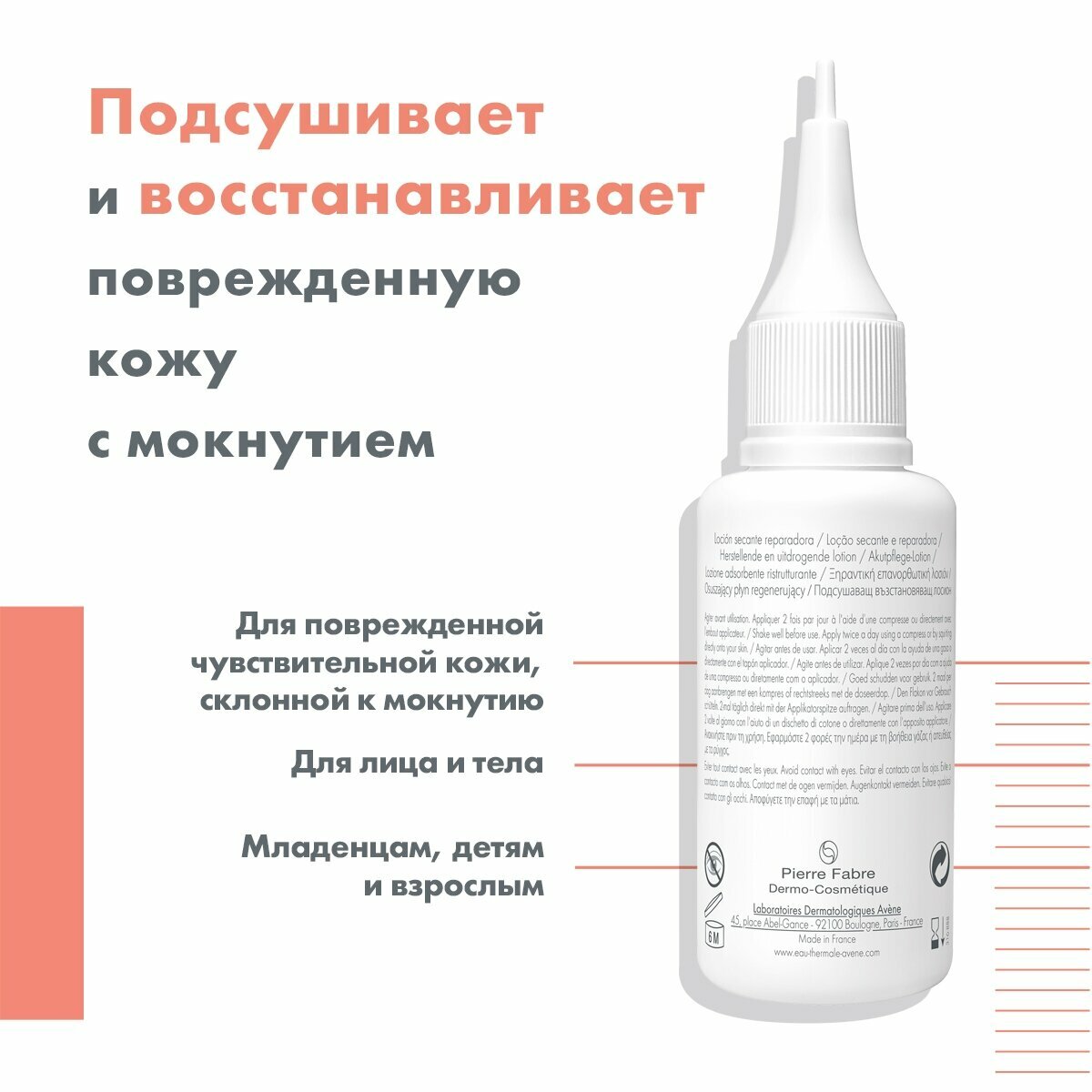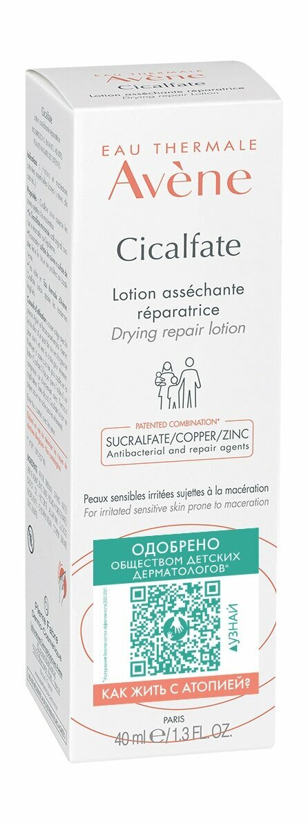 Лосьон Cicalfate для восстановления чувствительной, раздраженной и поврежденной кожи младенцев, детей и взрослых. Для мокнущих поверхностных повреждений кожи и внешних слизистых. Подсушивает кожу, быстро возвращает раздраженной коже чувство комфорта. Одобрено Обществом детских дерматологов. В составе лосьона: Микронизированный сукральфат - уникальный компонент - для быстрого восстановления кожи. Комбинация сульфата меди и сульфата цинка помогает сохранить кожу здоровой, ограничивая распространение бактерий. Обогащенный Термальной водой Avène крем успокаивает раздраженную и поврежденную кожу. Не содержит спирта и не вызывает жжения кожи. Не оставляет следов на одежде.
