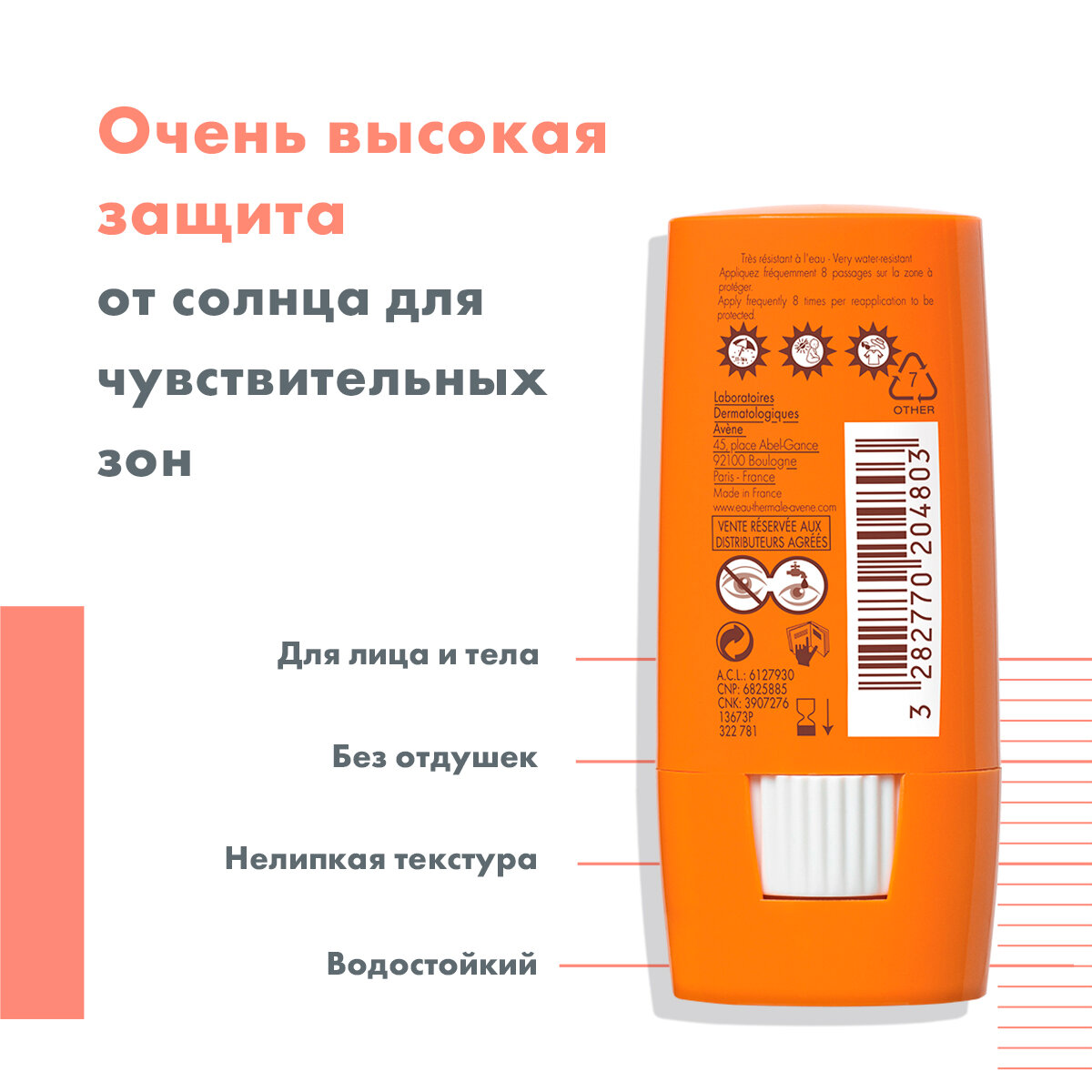Солнцезащитный стик SPF-50+ для чувствительных зон, 8 г (Avene)
