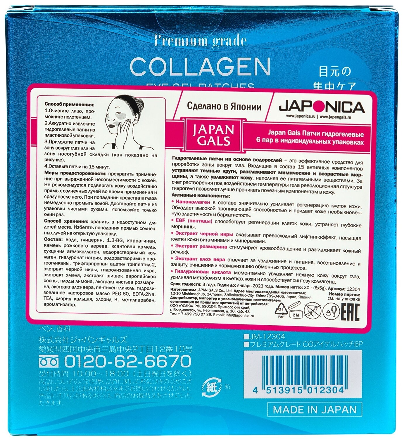 | Способ применения | Очистите лицо, промокните полотенцем. Аккуратно извлеките гидрогелевые патчи из пластиковой упаковки. Приложите патчи на зону вокруг глаз (как показано на картинке справа). Оставьте патчи на 15 минут. |