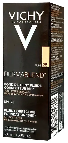 Vichy Dermablend — тональный крем с разглаживающими свойствами. Формула, подходящая для проблемной и нежной кожи, гарантирует ровный эпидермис, замедляет выработку кожного сала и снижает частоту воспалений и прыщей. Угри, жирное и проблемное лицо? Благодаря этому профессиональному косметическому средству никто не заметит неприглядных изменений.Легкая субстанция, доступная в нескольких цветах (включая очень яркий, подходящий для бледных женщин), выравнивает цвет лица, идеально с ним сливается и не создает эффекта маски. Активные компоненты – салициловая кислота и эперулин – активно борются с угревой сыпью, подсушивают прыщики и препятствуют образованию новых. Препарат остается на эпидермисе до 16 часов, эффективно матируя кожу и маскируя несовершенства. Косметика не подчеркивает неровности, а сглаживает их, заходя в складки и морщины и оптически заполняя их. Не засоряющая, гипоаллергенная формула не вызывает черных точек.Благодаря тональному средству Vichy Dermablend вы скроете нежелательные прыщики, пятна или шрамы, а также дополнительно уменьшите сияние кожи. Позвольте себе выглядеть безупречно, даже если цвет лица далек от совершенства.ПрименениеНанесите небольшое количество косметического средства на чистое и увлажненное лицо. Кистью, спонжем или кончиками пальцев распределите средство, уделяя особое внимание правильному втиранию в проблемных местах (у линии роста волос, в области челюсти).
