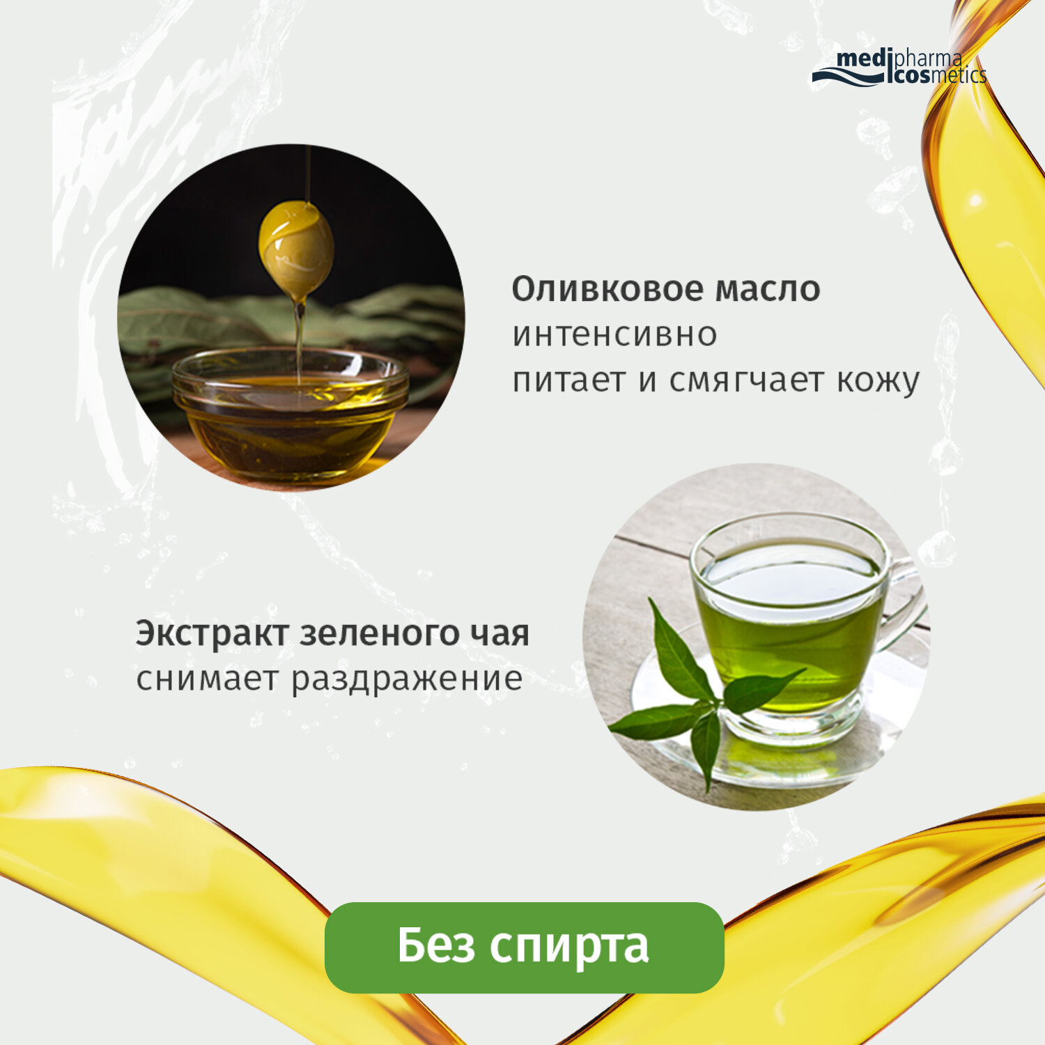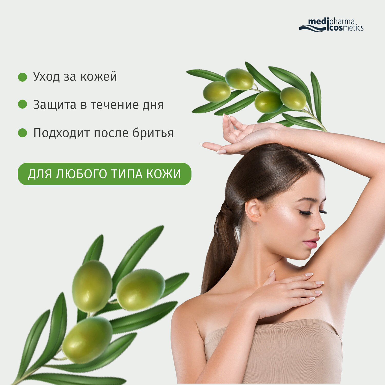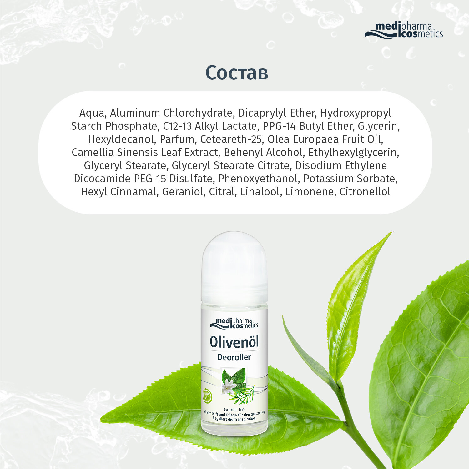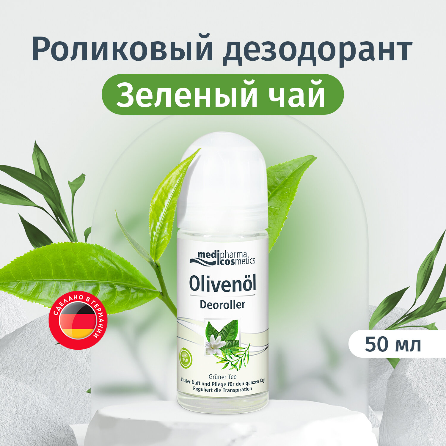 MEDIPHARMA COSMETICS – немецкий косметический бренд, входящий в ТОП-3 продаж в аптеках Германии, представленный ранее в России торговой маркой PHARMATHEISS COSMETICS.Серия средств по уходу за кожей лица и тела Olivenöl в оригинальной немецкой упаковке заменит широко известный бренд D'oliva.Medipharma cosmetics Olivenöl дезодорант роликовый "Зеленый чай" (ранее D'oliva дезодорант роликовый "Зеленый чай") создан на основе высокоэффективной формулы, которая содержит тосканское оливковое масло первого холодного отжима. Эффективный состав гарантирует бережный уход за кожей и свежесть на протяжении 24-х часов. Дезодорант не содержит спирта, успокаивает раздражение кожи после бритья, придает ощущение свежести.