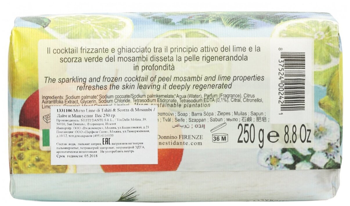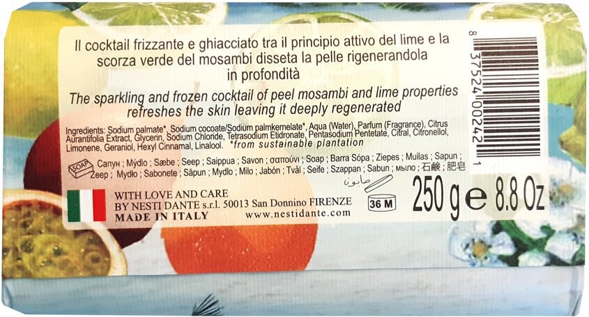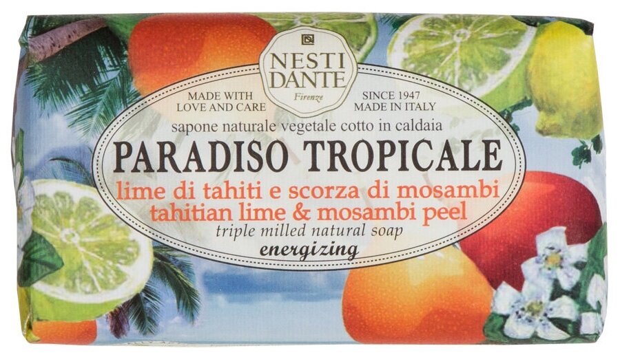 Мыло Tahitian Lime & Mosambi Peel (Лайм и мангустин) заряжает позитивом и радует ароматом экзотических фруктов из дальних стран. Nesti Dante экологически чистое мыло, обогащенное растительными экстрактами и маслами. Не содержит вредных поверхностно-активных веществ, сульфатов, парабенов, синтетических масел и искусственных красителей. Без аллергенов и ингредиентов животного происхождения. Кусок мыла не размокает и быстро восстанавливается после длительного контакта с водой.