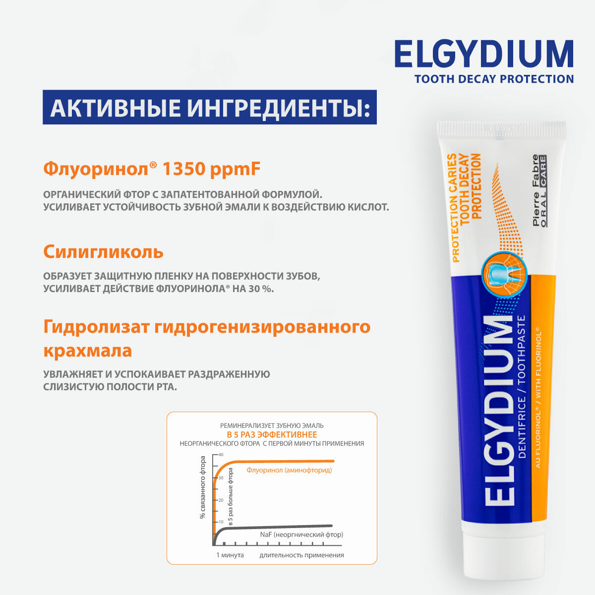 Эльгидиум Защита от кариеса зубная паста, снижающая риск развития кариеса. Fluorinol - аминофторид второго поколения (патент компании Пьер Фабр) реминерализует зубную эмаль в 5 раз эффективнее фторида натрия. Укрепляет и защищает эмаль защет ускоренной фиксации фтора в зубной эмали. Силигликоль - образует защитную плёнку, которая обеспечивает фиксацию флуоринола на поверхности зубной эмали. Повышает устойчивость эмали к воздействию кислот. Препятствует развитию кариеса; имеет свежий, мятный, длительный вкус.