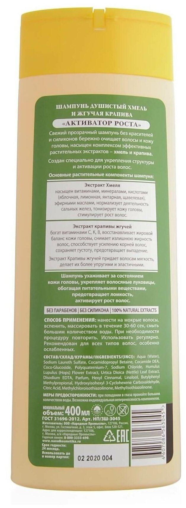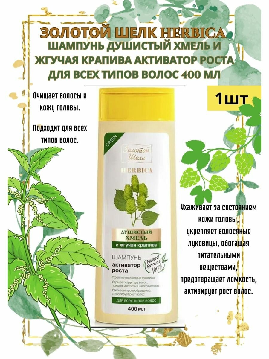 Шампунь Золотой шелк Herbica Душистый хмель и жгучая крапива Активатор роста 400 мл Народные Промыслы ООО (573297)