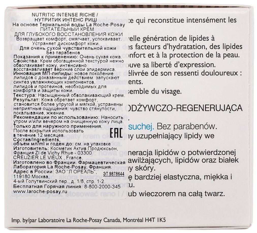 Питательный крем для глубокого восстановления кожи Nutritic Intense Rich La Roche Posay предназначен для ухода за очень сухой чувствительной кожей. Без дополнительного добавления консервантов по сравнению с формулой крема в тюбике. Насыщенный ультра-питательный крем для глубокого восстановления кожи содержит МП-Липиды - активный компонент нового поколения, который является результатом дерматологических разработок в области атопии. МП-Лпипды выполняют три главных функции для восстановления защиты кожи: 1. укрепляют структуру кожи, синтезируя протеины и энзимы, 2. активируют синтез керамидов для восстановления липидов, 3. восстанавливают увлажненность кожи.