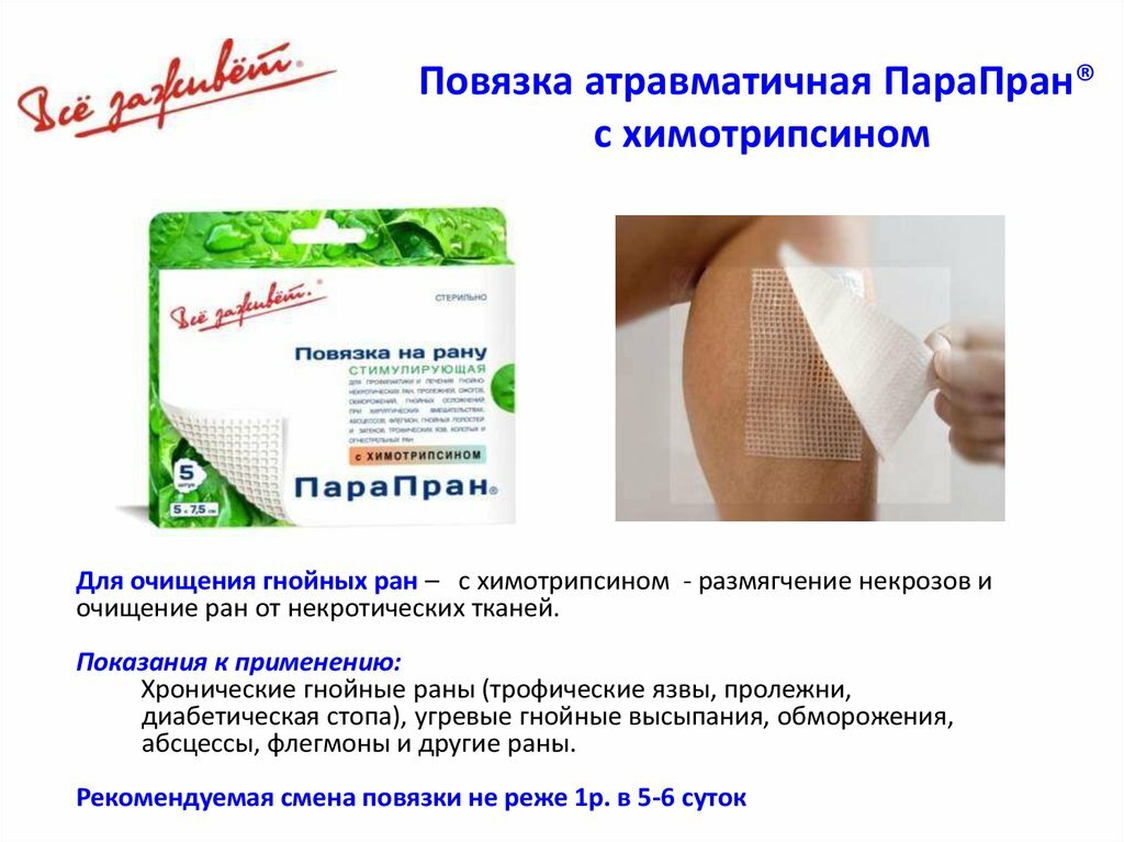 Повязка с химотрипсином обладает легким противовоспалительным, антивирусным и регенерирующим действием. Показания к применению: хронические гнойные раны (трофические язвы, пролежни, диабетическая стопа), угревые гнойные высыпания, обморожения, абсцессы, флегмоны и другие раны.