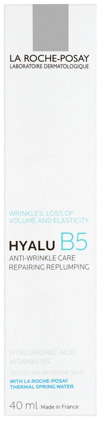 Уход против морщин для повышения упругости и эластичности кожи Hyalu B5 La Roche Posay - увлажняющий крем, повышающий упругость кожи. Увлажняющая и восстанавливающая формула с двумя видами чистой гиалуроновой кислоты (низкомолекулярной и высокомолекулярной) в эффективной концентрации и Витамином B5. Возвращает тонус и упругость, восполняя гидролипидный баланс кожи. Комплекс гиалуроновой кислоты обеспечивает интенсивное увлажнение кожи, повышение тонуса и эластичности. Витамин B5 – успокаивает и ускоряет процессы восстановления кожного барьера. Доказанная эффективность: Мгновенно кожа заметно более увлажненная, упругая и эластичная. Морщины менее выражены.