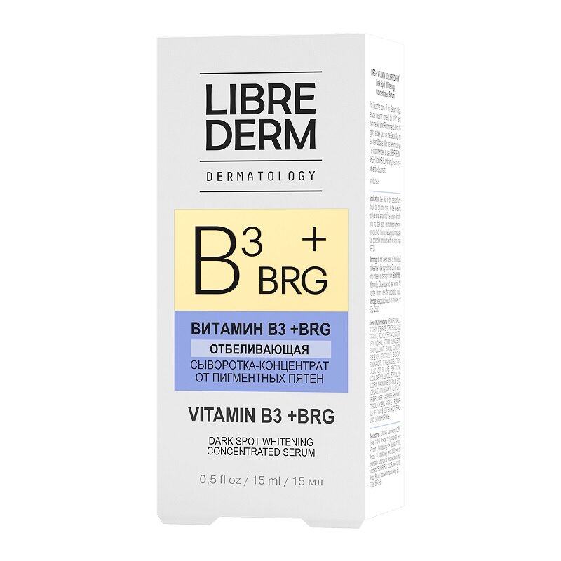 Крем для лица и тела BRG + ВИТАМИН В3 LIBREDERM® помогает поддерживать и продлевать эффект осветления пигментных пятен после интенсивных процедур устранения пигментных пятен. Крем позволяет контролировать воспалительные процессы, уменьшая покраснения, защищает клеточную ДНК от УФ-излучений, оказывает антиоксидантную защиту клеток. Благодаря биоактиву в составе сыворотки содержание меланина в области гиперпигментации сокращается на 31%*, выравнивается тон кожи. * подтверждено тестами in vitro
