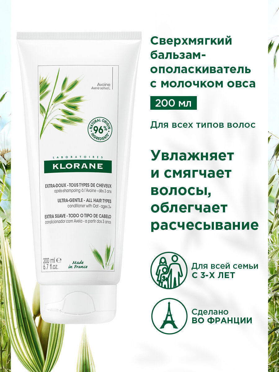 Преимущества: Бальзам-ополаскиватель с молочком овса моментально смягчает и увлажняет волосы, делает их более послушными, гладкими и шелковистыми. Средство облегчает расчесывание волос и восстанавливает их естественный блеск. Бальзам-ополаскиватель защищает волосы от агрессивных факторов окружающей среды. Средство подходит для ежедневного использования. Без парабенов. Рекомендовано для: Всех типов волос. Взрослых и детей с 3-х лет. Ключевые ингредиенты: Экстракт зерен овса: Увлажняет, смягчает и защищает волосы, поддерживает природный баланс кожи головы и волос, стимулирует рост волос.