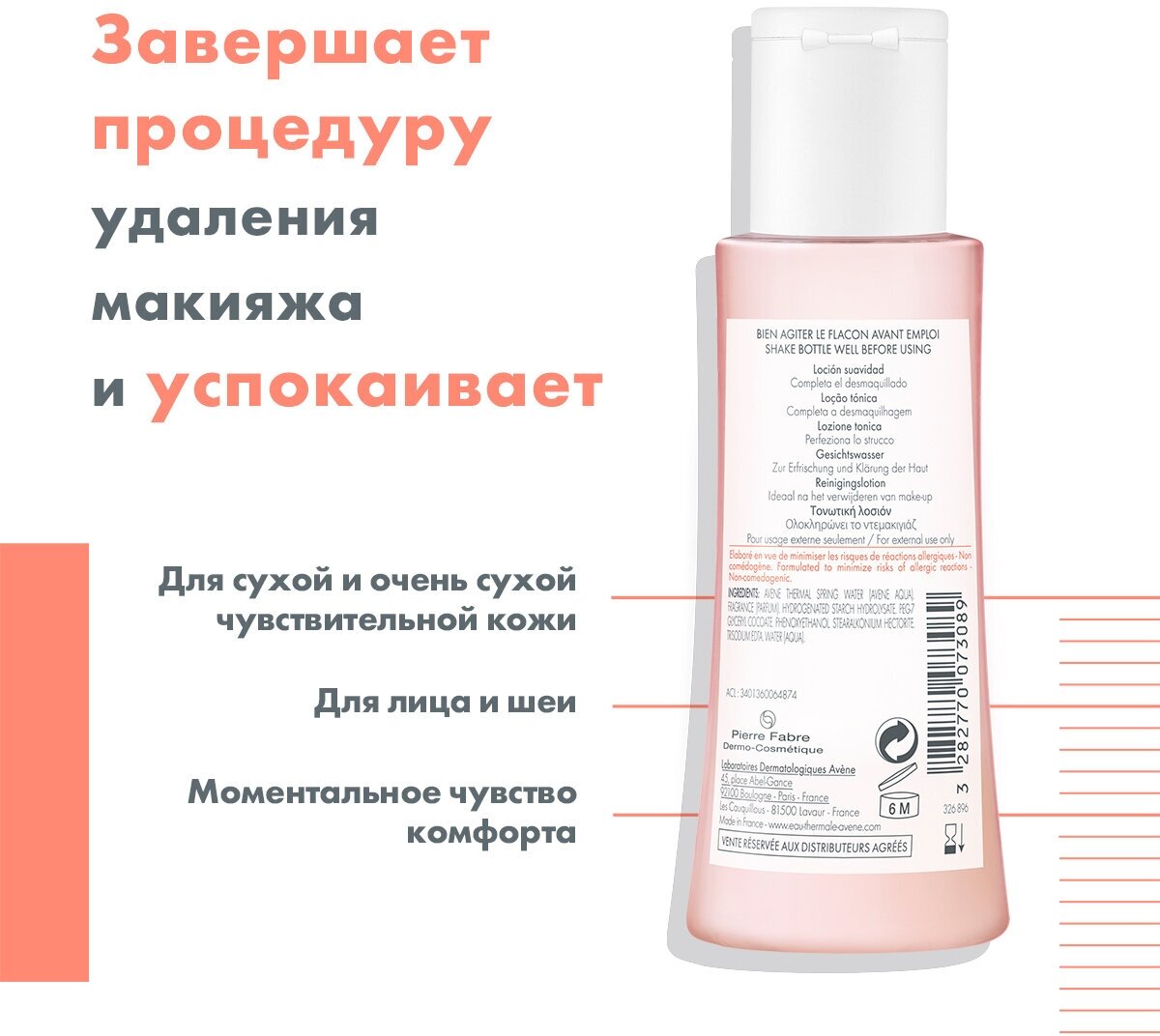 AVENE Тонизирующий лосьон.Мягкий тонизирующий лосьон без спирта для сухой и очень сухой чувствительной кожи:1. Успокаивает кожу и снимает раздражение.2. Природные силикаты в виде суспензии в составе защищают кожу от внешних воздействий, образуя защитную пленку.Разработано с целью минимизации риска аллергических реакций.Использование средства смягчает, успокаивает кожу, возвращая ей комфорт.Активные компоненты: термальная вода EAU THERMALE AVENE проявляет смягчающее и противораздражительное действие, помогает избавиться от чувства стянутости и сухости кожи; силикаты (производные стеариловой к-ты) образуют тончайшую защитную пленку, не позволяя агрессивным факторам внешней среды травмировать кожу.