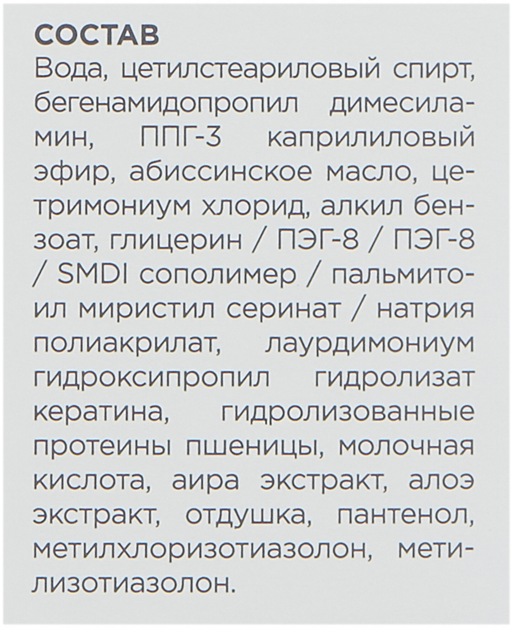 | Состав | Aqua, Cetearyl Alcohol, Behenamidopropyl Dimethylamine, PPG-3 Caprylyl Ether, Crambe Abyssinica Seed Oil, Cetrimonium Chloride, C12 – 15 Alkyl Benzoate, Glycerin /PEG-8/PEG-8/SMDI, Copolymer/Palmitoyl Myristyl Serinate/Sodium Polyacrylate, Laurdimonium Hydroxypropyl Hydrolyzed Keratin, Hydrolyzed Wheat Protein, Lactic acid, Acorus Calamus Root Extract, Aloe Barbadensis Leaf Extract, Perfume, Panthenol, Methylchloroisothiazolinone/ Methylisothiazolinone |