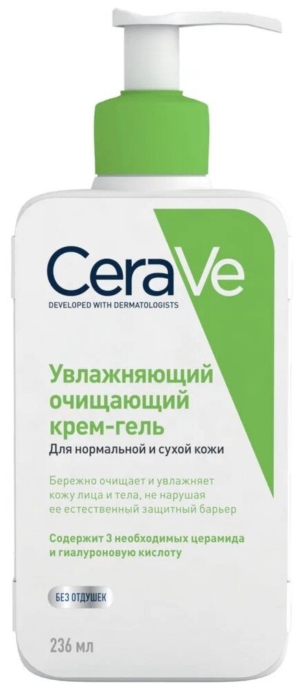 Мягкий гипоаллергенный очищающий крем-гель Цераве подходит для бережного очищения обезвоженной сухой чувствительной кожи. Средство эффективно удаляет загрязнения, макияж и кожное сало, способствует восстановлению гидролипидной мантии, интенсивно увлажняет. CeraVe Hydrating Cleanser for Normal to Dry Skin не образует пены. Технология MVE предполагает постепенное высвобождение составляющих формулы, что обеспечивает длительную гидратацию рогового слоя. Высокая переносимость и гипоаллергенность продукта подтверждена оценкой ECARF (Европейского центра исследования аллергии). Активные компоненты: церамиды (1, 3, 6-II) восполняют недостаток церамидов в роговом слое, уменьшают сухость кожи и укрепляют защитный барьер; гиалуроновая кислота интенсивно и надолго увлажняет эпидермис; глицерин защищает кожу и уменьшает потерю влаги; холестерол смягчает кожу, помогает поддерживать целостность клеточных мембран; фитосфингозин снимает воспаление, проявляет антисептические свойства, участвует в образовании липидного слоя эпидермиса. без мыла без отдушек без парабенов гипоаллергенно некомедогенно