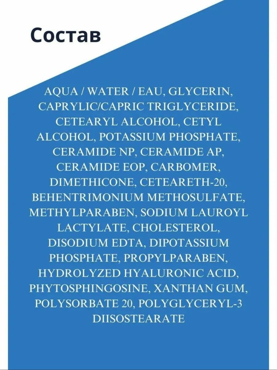 | Состав | aqua/water, glycerin, caprylic/capric, triglyceride, cetearyl alcohol, cetyl alcohol, dimethicone, phenoxyethanol, polysorbate 20, ceteareth-20, behentrimonium methosulfate, polyglyceryl-3 diisostearate, sodium lauroyl lactylate, ethylhexylglycerin, potassium phosphate, disodium edta, dipotassium phosphate, ceramide np, ceramide ap, phytosphingosine, cholesterol, xanthan gum, carbomer, sodium hyaluronate, tocopherol, ceramide eop |