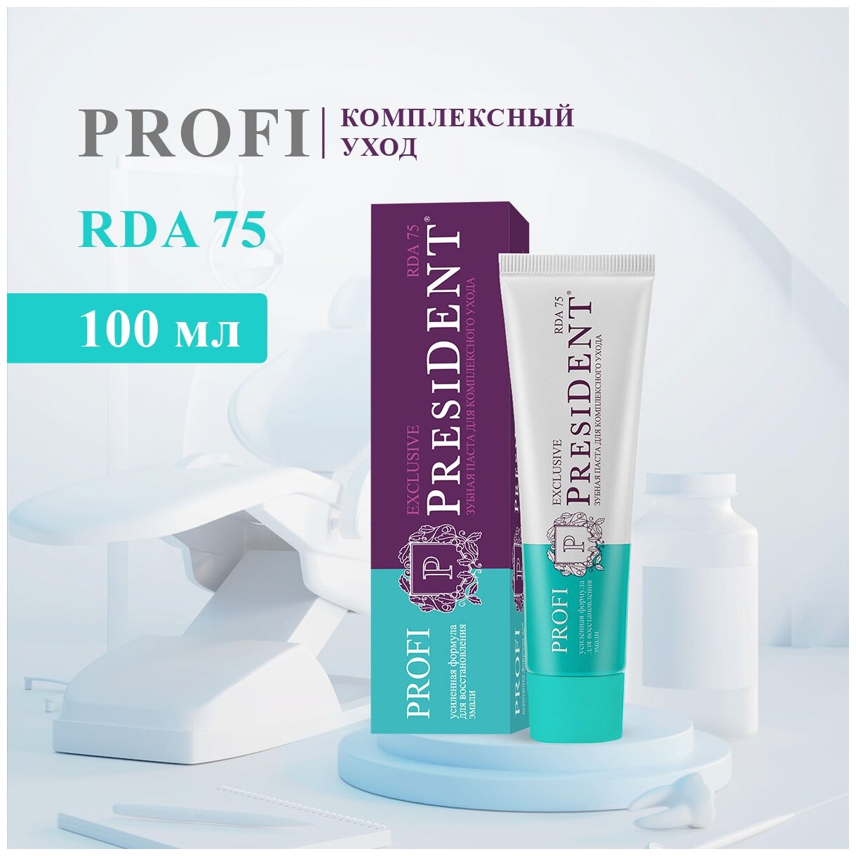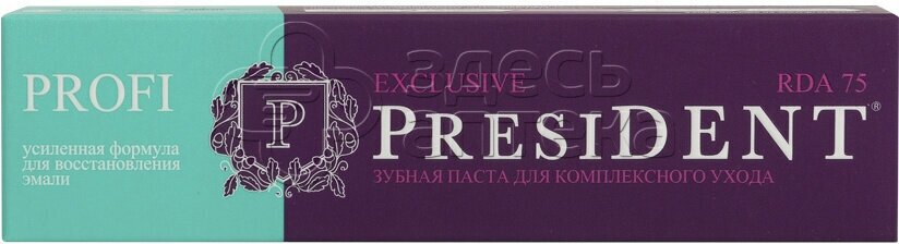 Зубная паста PRESIDENT PROFI Exclusive RDA 75* рекомендуется при различных воспалениях полости рта, а также при пониженном иммунитете, подходит для ежедневного применения. Гидроксиапатит реминерализует эмаль. Прополис повышает иммунитет. Тимьян снимает воспаление. Фтор укрепляет эмаль и защищает от кариеса. Мята освежает дыхание. Гексэтидин оказывает антибактериальный эффектЭффективность зубной пасты клинически доказана: Уменьшает воспаление десен на 56%, снижает кровоточивость на 91%, уменьшает количество налета на 43%.RDA* – это строгий контроль размера и концентрации абразивных частиц. Абразивом являются сферолиты SYLOBLANC®, которые безопасно и эффективно удаляют налёт, очищают и полируют зубную эмаль Чем выше абразивность зубной пасты, тем лучше она будет счищать с поверхности эмали бактериальный и пигментный налет. Применение: ежедневно, после каждого приема пищи, не менее двух раз в день.
