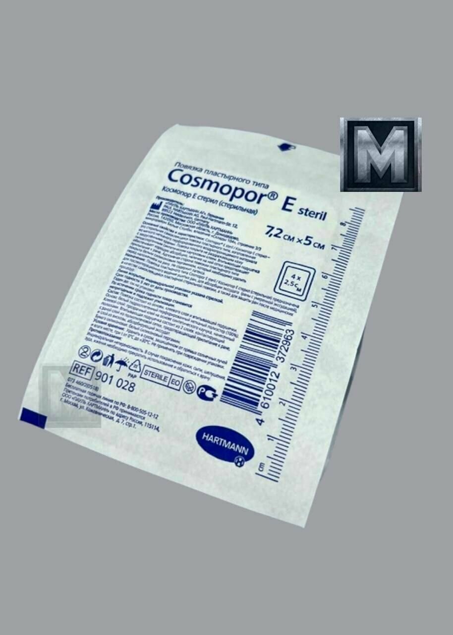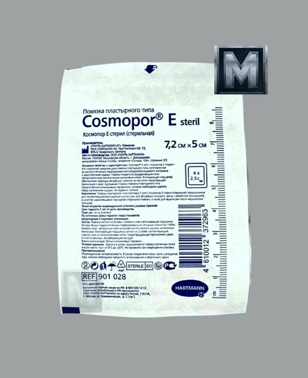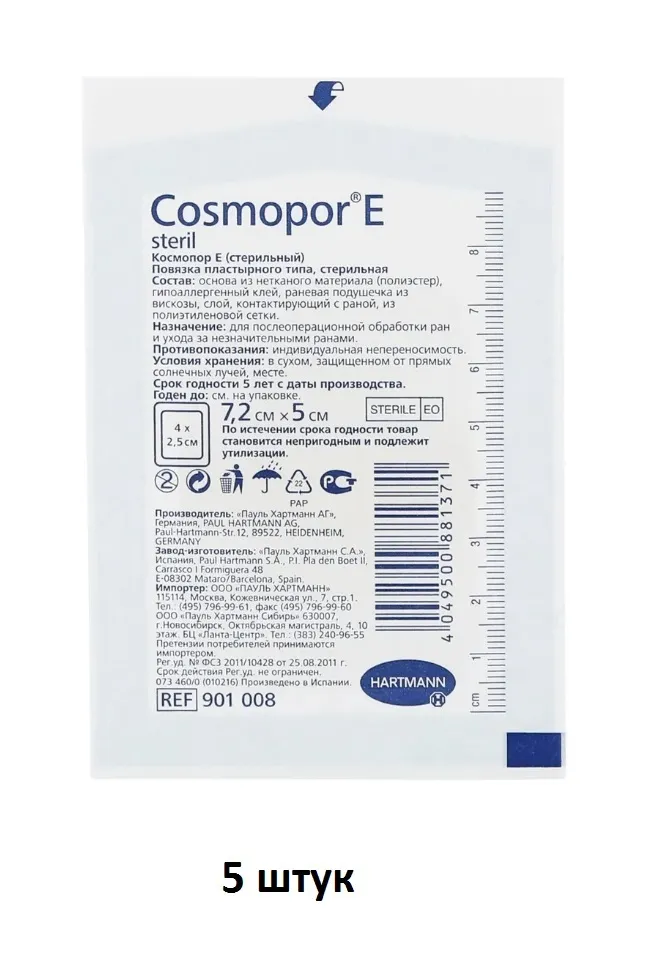 Сosmopor E - самоклеящиеся послеоперационные повязки 7,2 х 5 см. Отличительной чертой продукта является продуманный выбор материалов, которые позволяют удовлетворить все потребности по уходу в послеоперационный период:Индивидуальная стерильная упаковка.Каждая единица защищена пропитанной силиконом бумагой с отметкой, где правильно нужно вскрывать упаковку.В основе повязок нетканый материал (полиэстер) – эластичный, легко моделирует повязку на ране.Повязка крепится на коже с помощью клея из синтетического каучука, без примеси канифоли – не вызывает раздражения и прекрасно удерживает повязку на месте.Вискоза, покрытая защитной полиэтиленовой микросеткой, позволяет эффективно впитывать раневой экссудат, без прилипания материи к коже с последующей вторичной травматизацией прооперированного участка.Лейкопластырь космопор 7,2х5 подходит для закрытия небольших ран и ссадин. Шву будет обеспечена благоприятная для заживления среда с отведением излишней жидкости и предотвращением развития инфекций.Размер впитывающей подушечки 4 х 2,5 см, размер всей повязки с клеящим краем - 7,2 х 5 см. При подборе размера повязки обращайте внимание, что размер впитывающей подушечки должен быть больше размера раны.
