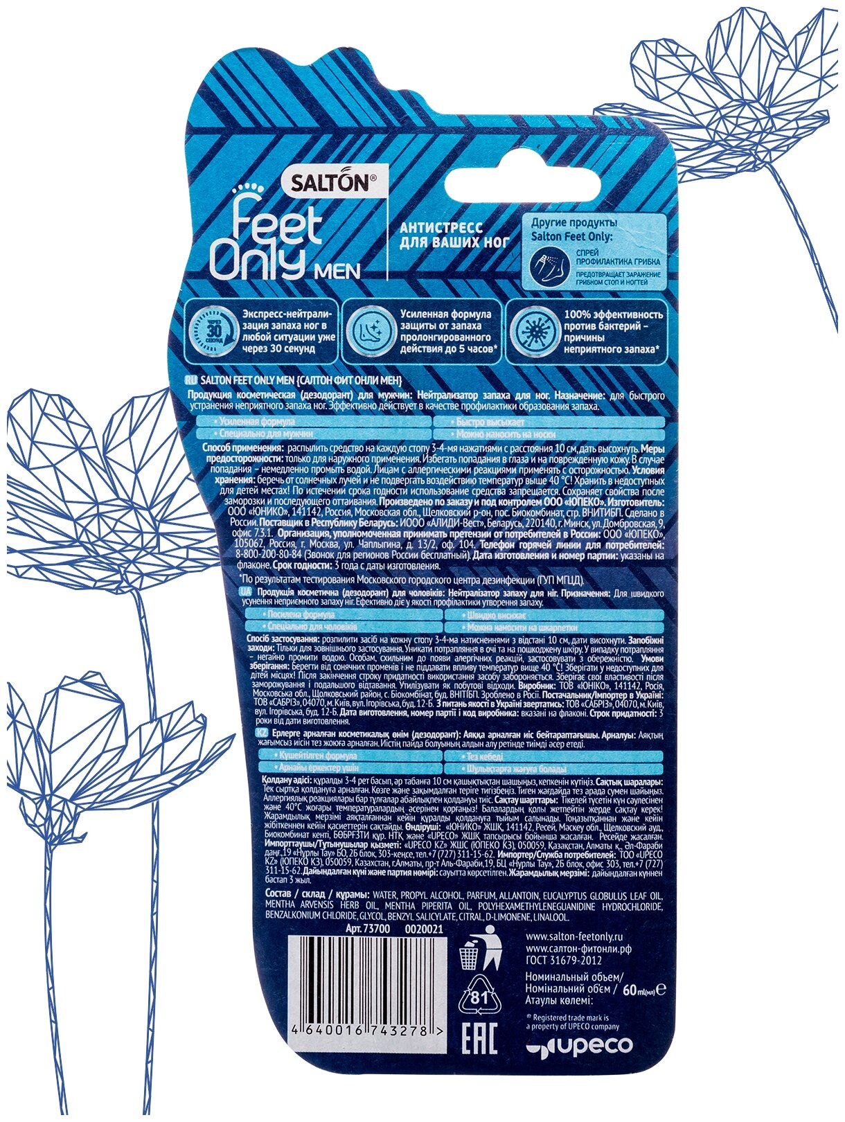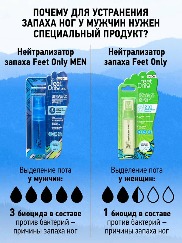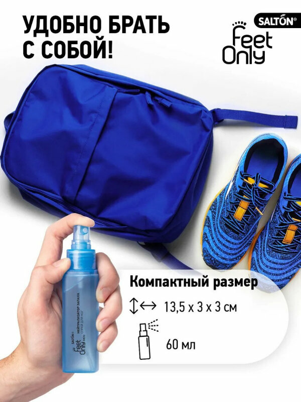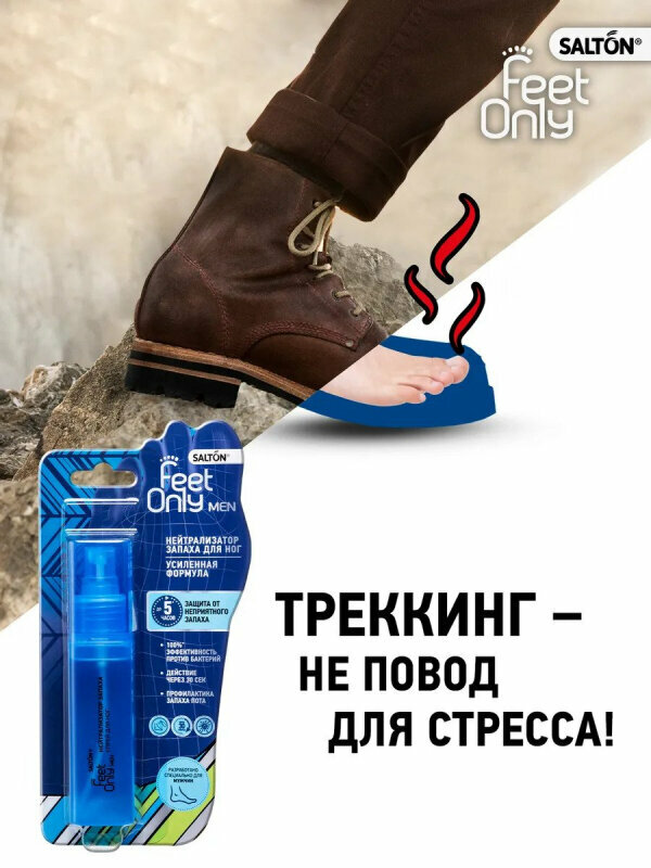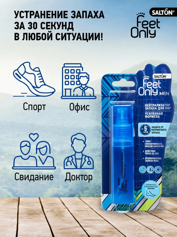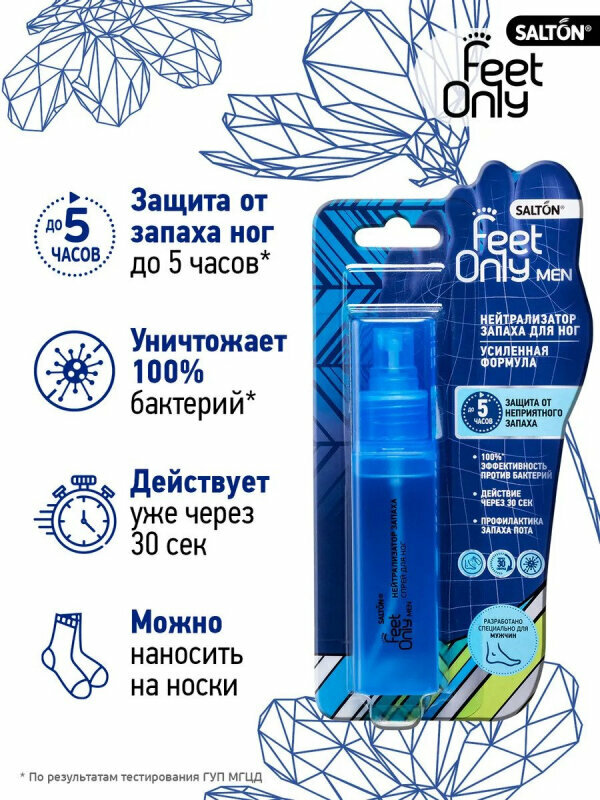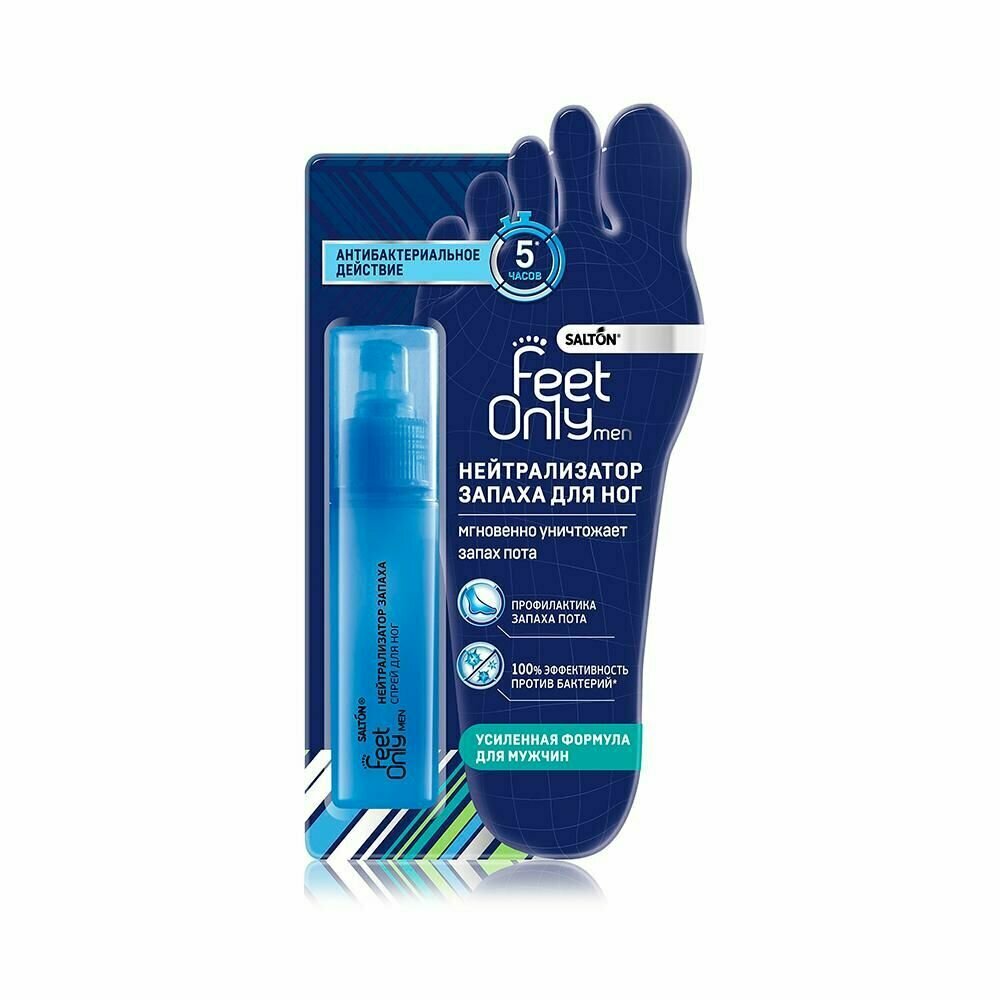 В отличие от дезодоранта для ног, нейтрализатор запаха Salton Feet Only мгновенно уничтожает все известные болезнетворные бактерии и устраняет неприятный запах ног у мужчин.
