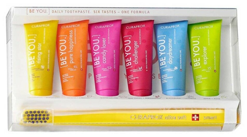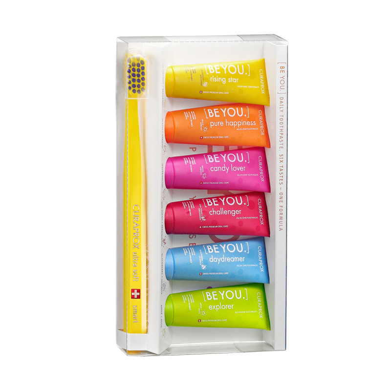 Набор CURAPROX Be you set, состоящий из шести семейных зубных паст Be you (10 мл) и детской зубной щётки CURAPROX smart.