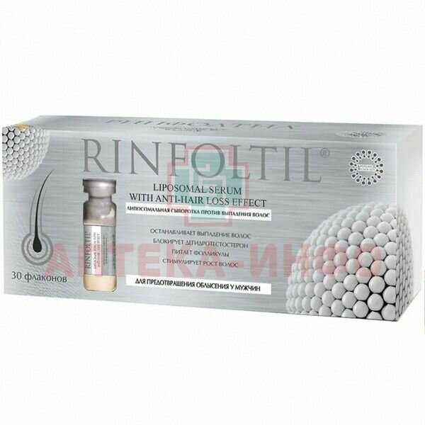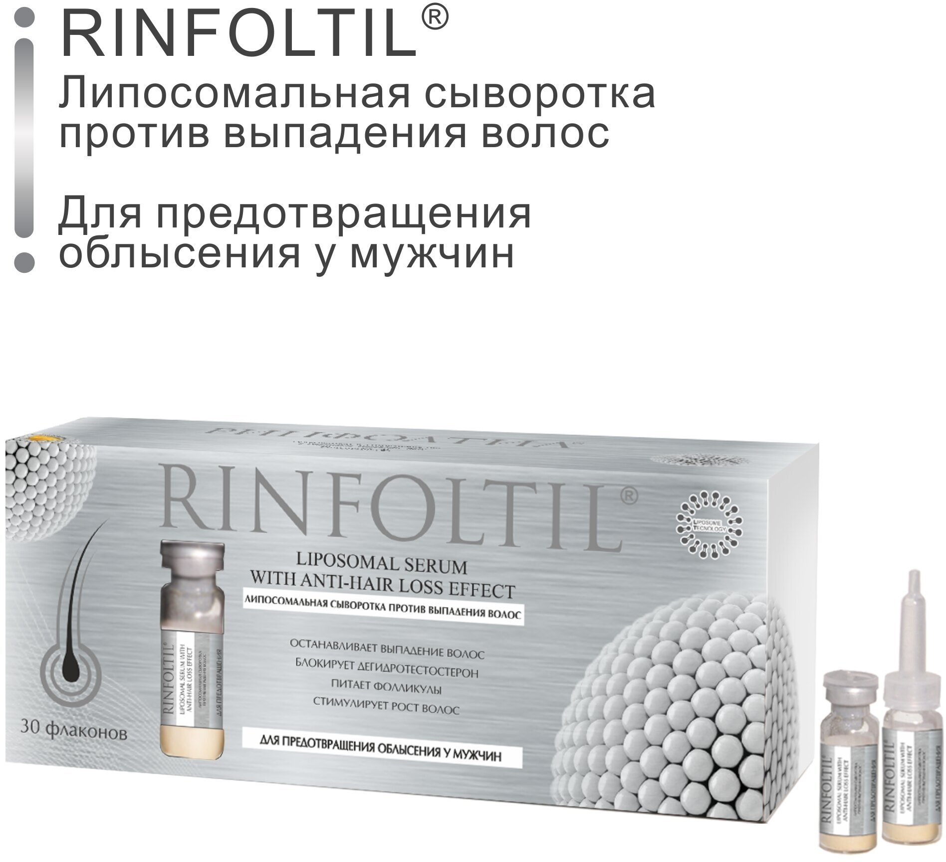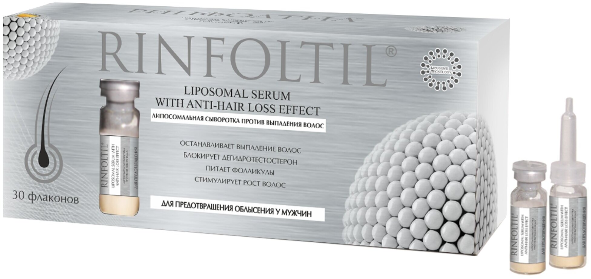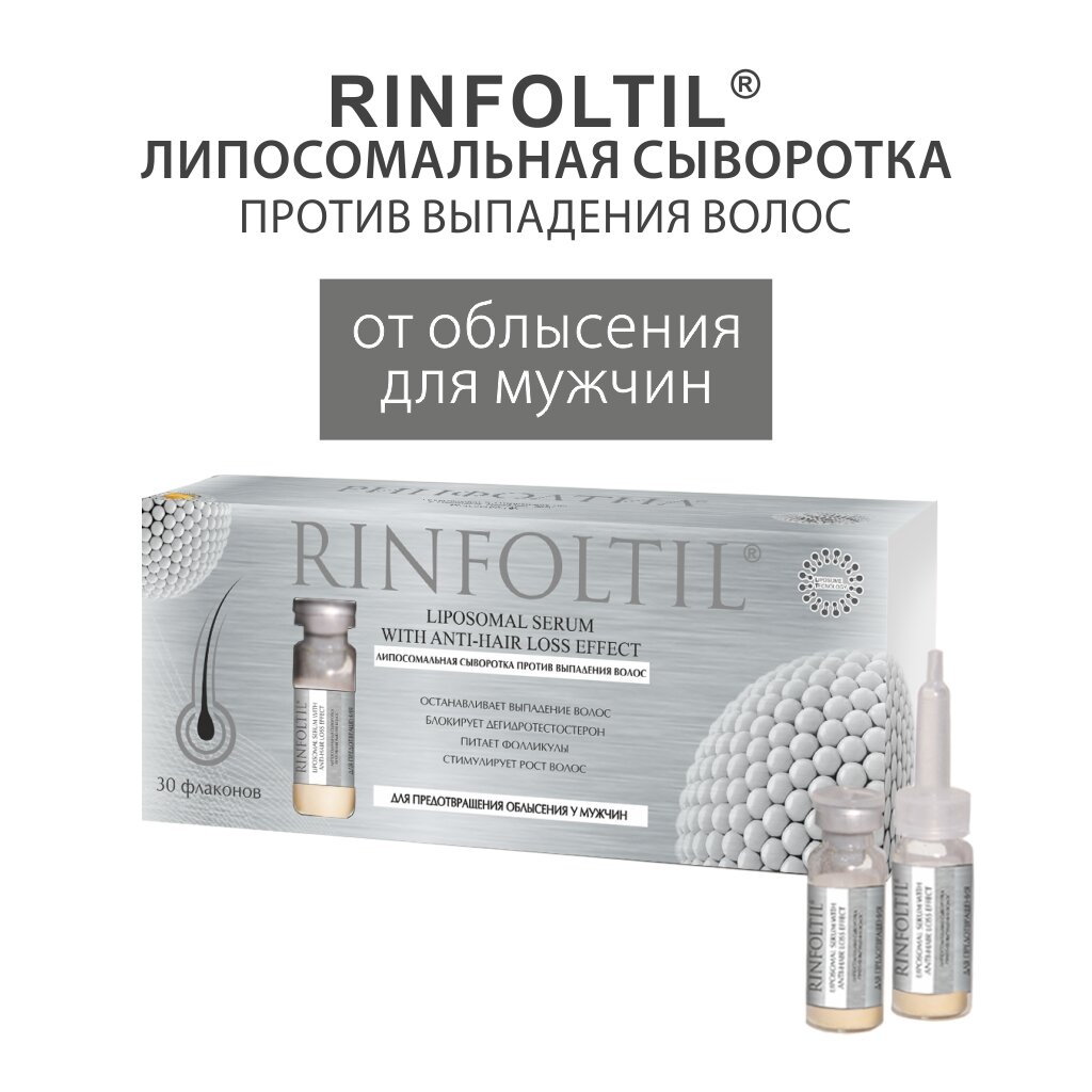 Ринфолтил® Липосомальная сыворотка против выпадения волос. Для предотвращения облысения у мужчин, 30 флаконов по 160 мг.Липосомальная сыворотка RINFOLTIL® создана на основе последних научных разработок и направлена на предотвращение выпадения волос и возобновление их роста. Сыворотка предназначена для предотвращения облысения у мужчин. Липосомы, с заключенными внутрь биологически активными компонентами, легко проходят эпидермальный барьер, проникают в глубокие слои кожи и непосредственно в волосяные фолликулы. Сыворотка работает в трех направлениях: питает кожу головы и корни волос, стимулирует волосяные фолликулы, укрепляет стержни волос. РЕЗУЛЬТАТ: сыворотка блокирует действие дигидротестостерона, останавливает повышенное выпадение волос, активирует волосяные фолликулы, увеличивает продолжительность фазы активного роста волос, показана при различных видах алопеции в моно и комплексной терапии. СПОСОБ ПРИМЕНЕНИЯ: применять ежедневно на протяжении 3-х месяцев. Равномерно нанесите сыворотку на проблемные участки кожи головы, массируйте, пока сыворотка не впитается в кожу.Для очищения кожи головы и усиления эффекта рекомендуется использовать шампуни RINFOLTIL. Флакон рассчитан на однократное применение. Наносите 1 раз в день на чистую кожу головы на протяжении 3-х месяцев. Вскройте флакон. Добавьте питьевую воду комнатной температуры до верхнего края этикетки. Наденьте дозатор на флакон. Энергично встряхните флакон до растворения таблетки. Равномерно нанесите сыворотку на проборы и проблемные участки с поредением или отсутствием волос. Массируйте, пока сыворотка не впитается в кожу. Не смывать! Уложите волосы привычным способом.