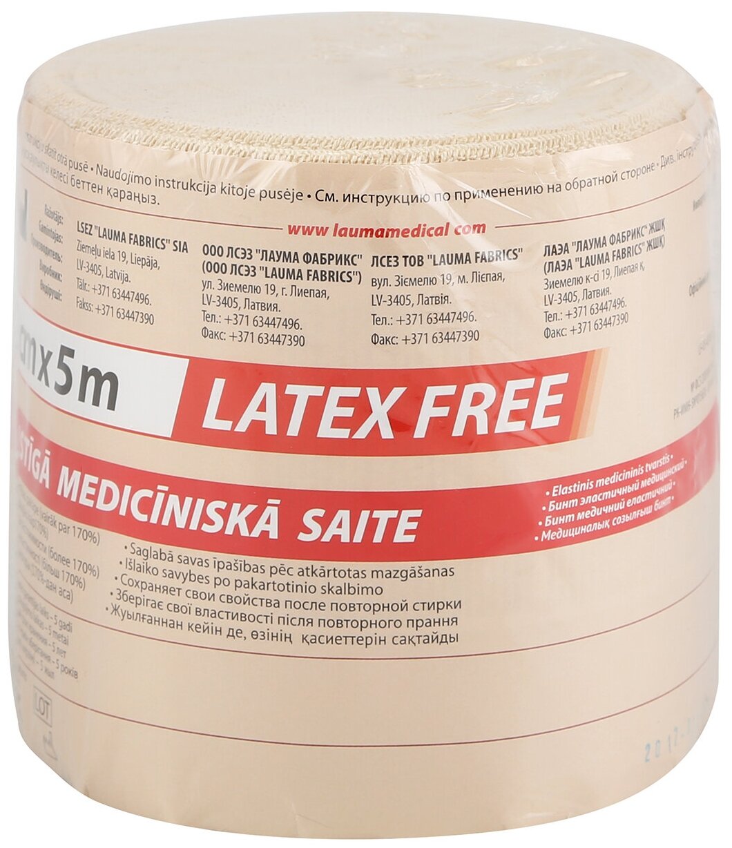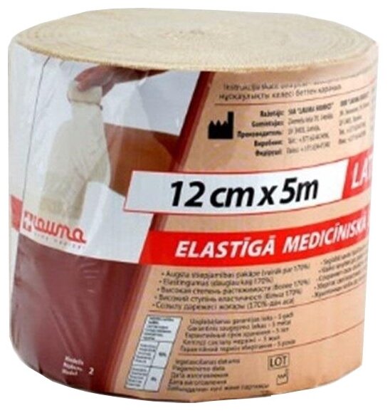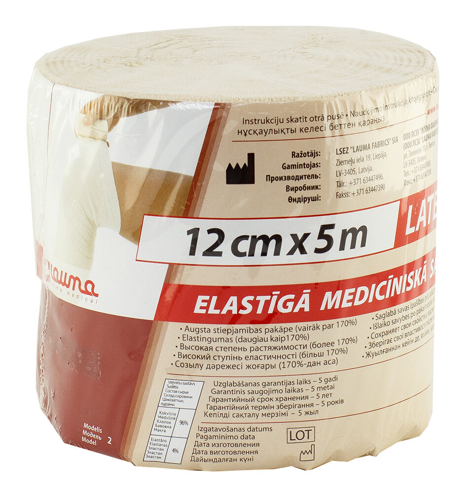 Состав Хлопок 96%, эластан 4%.ОписаниеКомпрессионное действие - бинты эластичные производства LAUMA Medical подвергая ткани сустава внешней компрессии выдавливают лишнюю жидкость из интерстициального (межклеточного) пространства в лимфатические сосуды, что уменьшает отек и препятствует, впоследствии, его образованию.Фиксирующее действие - бинт эластичный LAUMA Medical создает компрессию на связочный и мышечный аппарат конечности или сустава, что приводит к уменьшению подвижности мышц, сухожилий и подкожной клетчатки. Создание покоя позволяет многократно сократить время излечения. Создавая различную степень компрессии можно добиться оптимального сочетания эффекта покоя тканей и свободы движения.Согревающее действие - бинты производства LAUMA Medical создают оптимальный тепловой баланс, что способствует уменьшению болевого синдрома, увеличению кровообращения и ускорению выздоровления тканей.Микромассажное действие - бинты LAUMA Medical в сочетании с движением воздействуют на кожу, подкожную клетчатку, мышцы и связки, вытесняют кровь из капиллярной сети в вены и тем самым способствуют ускорению микроциркуляции в них. Нежно воздействуя на нервные окончания в биологически активных точках оздоровительно воздействует на весь организм.Регенерирующее действие - бинт эластичный LAUMA Medical увеличивает локальное кровоснабжение, вследствие согревающего и микромассажного воздействия, создаются оптимальные условия для регенерации (восстановления) поврежденных тканей.Защитное действие - при постоянном ношении эластичного бинта LAUMA Medical связки, мышцы, ткани сустава находятся в зафиксированном полуразогретом состоянии, что уменьшает вероятность повреждения сустава или тканей при нагрузке.Гипоаллергенность - при производстве эластичного бинта LAUMA Medical использует натуральный хлопок (96%). Характеристики: тканый, высокой растяжимости (более 170%), с 2-мя застежками, возможность повторного использования после стирки, натуральный состав (96% хлопок), более 40 лет на рынке.ДействиеКомпрессионное действие - бинты эластичные производства LAUMA Medical подвергая ткани сустава внешней компрессии выдавливают лишнюю жидкость из интерстициального (межклеточного) пространства в лимфатические сосуды, что уменьшает отек и препятствует, впоследствии, его образованию.Фиксирующее действие - бинт эластичный LAUMA Medical создает компрессию на связочный и мышечный аппарат конечности или сустава, что приводит к уменьшению подвижности мышц, сухожилий и подкожной клетчатки. Создание покоя позволяет многократно сократить время излечения. Создавая различную степень компрессии можно добиться оптимального сочетания эффекта покоя тканей и свободы движения.Согревающее действие - бинты производства LAUMA Medical создают оптимальный тепловой баланс, что способствует уменьшению болевого синдрома, увеличению кровообращения и ускорению выздоровления тканей.Микромассажное действие - бинты LAUMA Medical в сочетании с движением воздействуют на кожу.
