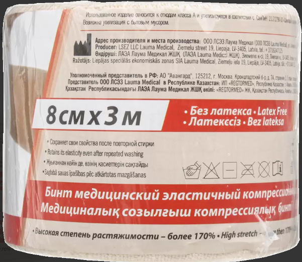 Эластичный компрессионный бинт ЛАУМА (ВЫСОКОЙ РАСТЯЖИМОСТИ) ввиду тканой технологии производства не имеет прямых аналогов и обладает рядом уникальных свойств. Бинт ЛАУМА в растянутом виде сохраняет форму. Не вызывает аллергических раздражений. Позволяет коже дышать. Компрессия сохраняется и при физической нагрузке и при покое. Край бинта не врезается в кожу. Обеспечивает комфорт и удобство. Возможен срез необходимой длины - конец бинта не требует дополнительной обработки. Сохраняет свойства даже при многократной стирке. Металлический фиксатор позволяет удерживать бинт в нужном месте.