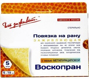 Заживляющая - с мазью метилурациловой 10% - стимулирует процесс регенерации, оказывает противовоспалительное и ранозаживляющее действие, ускоряя рост и грануляционное созревание ткани. Повязка на рану с метилурациловой мазью применяется при третьей стадии заживления, когда обработка раны уже не требуется, она очистилась и ей нужно помочь быстрее затянуться. Благодаря уникальным свойствам воска заживление раны происходит быстрее, так как по своему составу он очень напоминает человеческую кожу, и при его применении все репаративные процессы происходят в несколько раз быстрее.