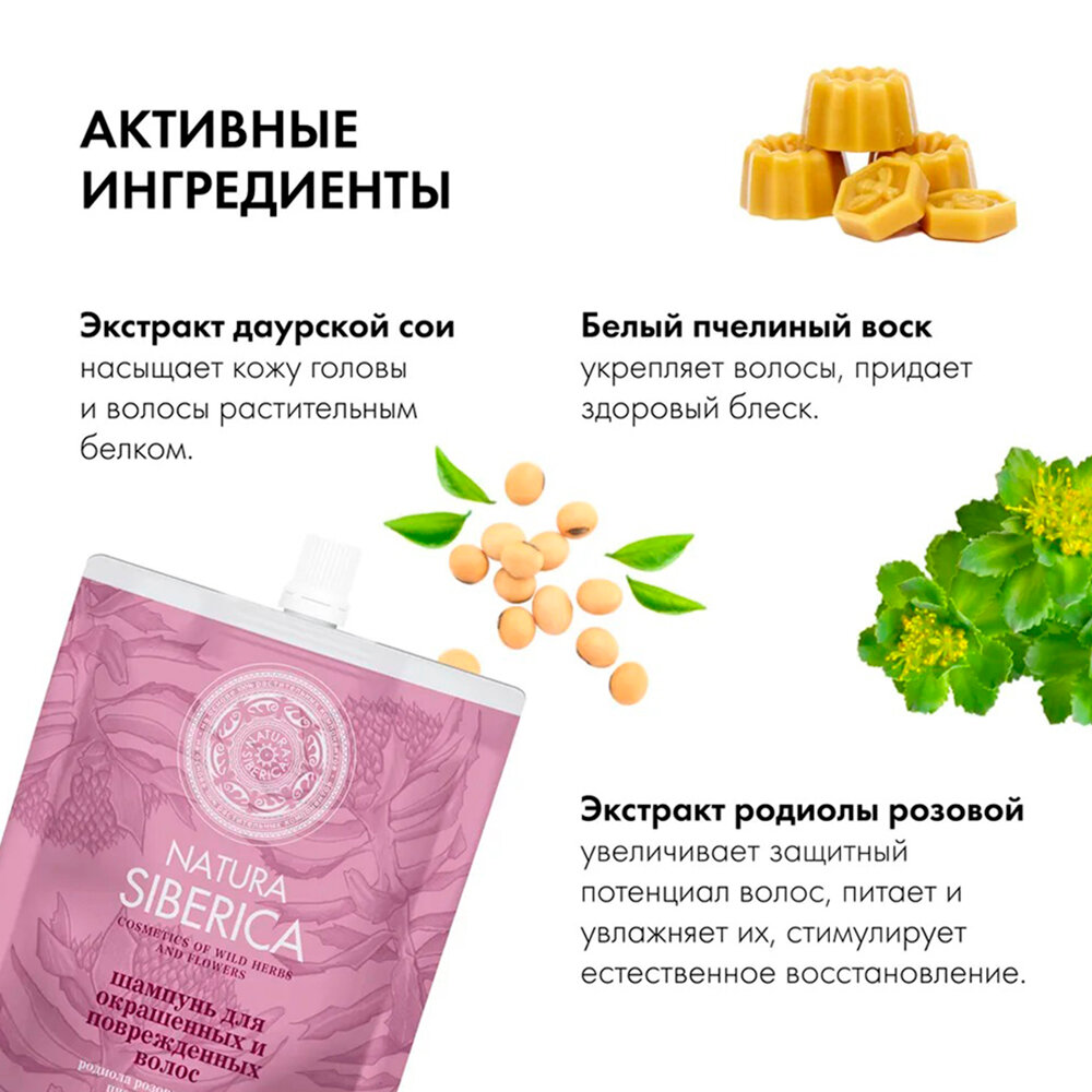 Родиола розовая и белый пчелиный воск. В сочетании с родиолой розовой, белый пчелиный воск обеспечивает естественный блеск волосам, а масло даурской сои, содержащее большое количество ценного растительного белка, нормализует структуру поврежденного волоса.