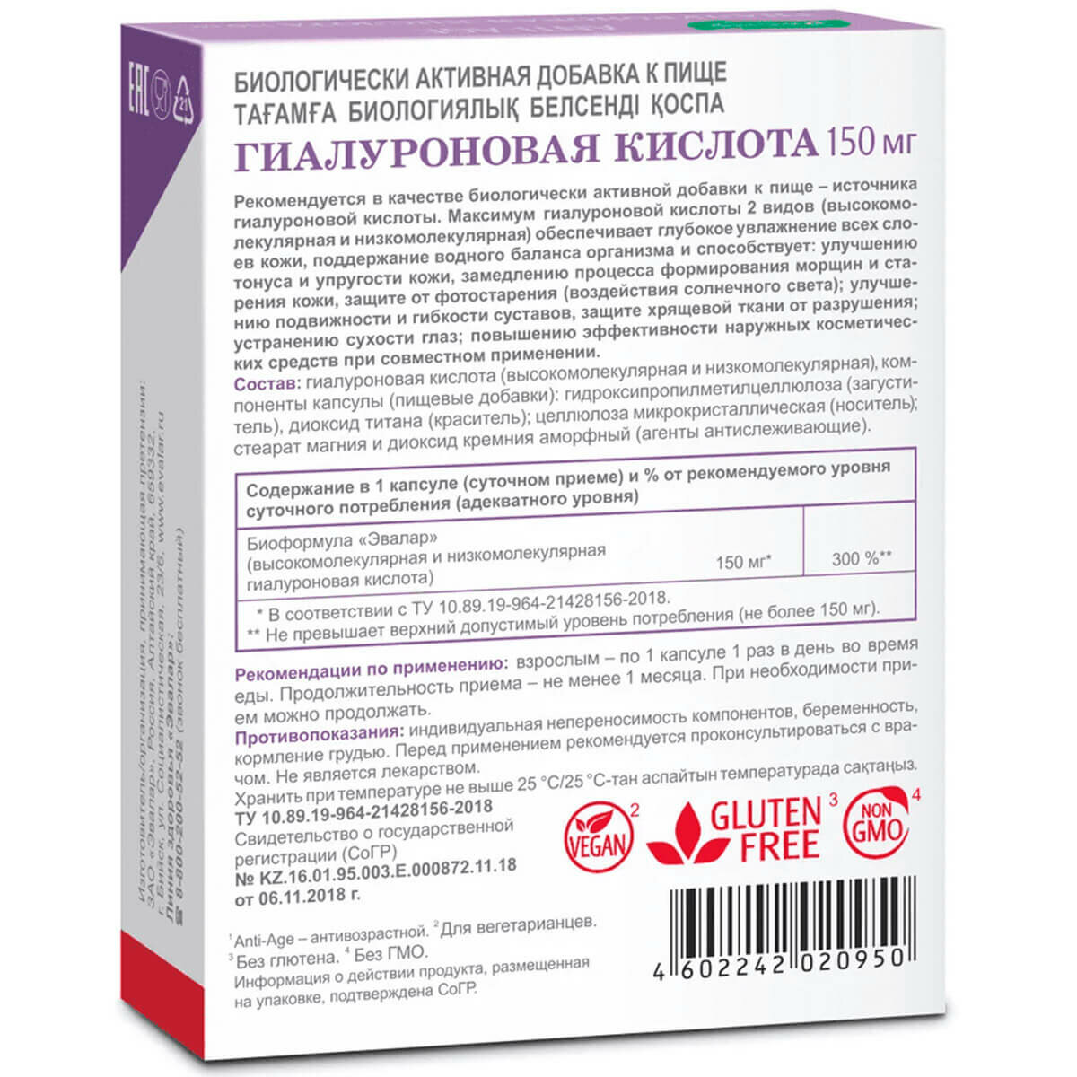 | Состав | Гиалуроновая кислота (высокомолекулярная и низкомолекулярная); стеарат магния и диоксид кремния аморфный (агенты антислеживающие), целлюлоза микрокристаллическая (носитель). |