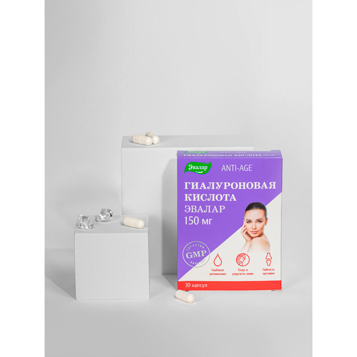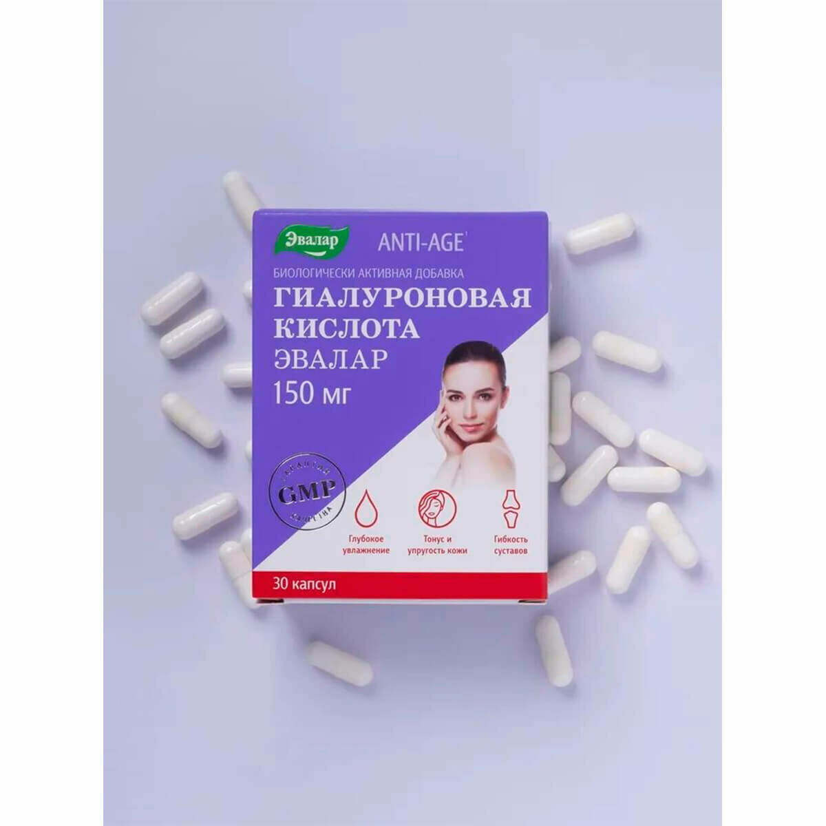 Применение гиалуроновой кислоты внутрь в виде капсул или таблеток в высокоразвитых странах является "золотым стандартом" комплексного подхода к решению проблем возрастных изменений кожи, волос, суставов, сердечно-сосудистой системы, глаз. Ведь, если до 25 лет в организме вырабатывается достаточное количество гиалуроновой кислоты, то с возрастом ее синтез постепенно начинает снижаться. В одной капсуле от Эвалар содержится суточный максимум гиалуроновой кислоты - 150 мг, который способствует глубокому увлажнению кожи, улучшению ее тонуса и упругости, защите от фотостарения, а также сохранению подвижности и гибкости суставов.