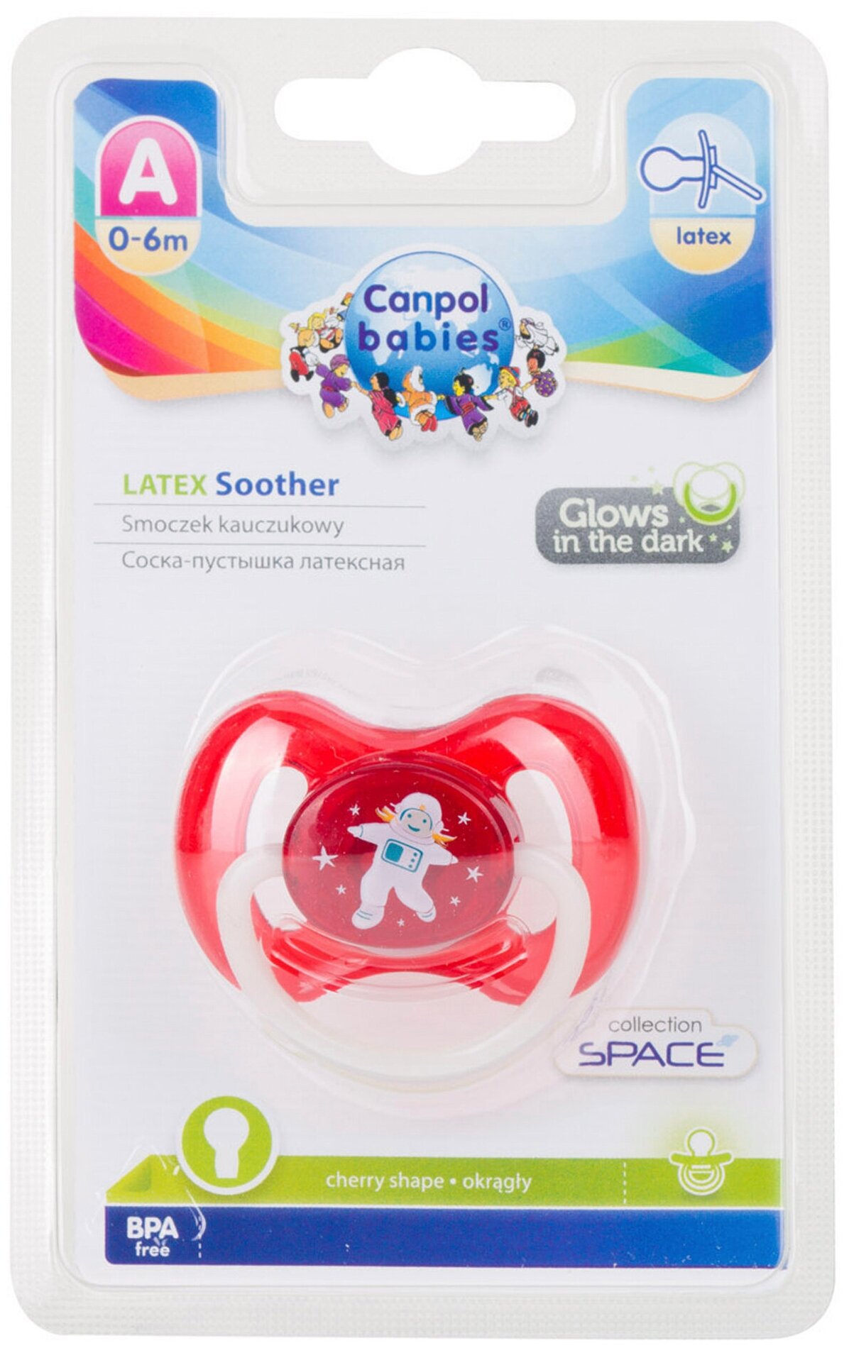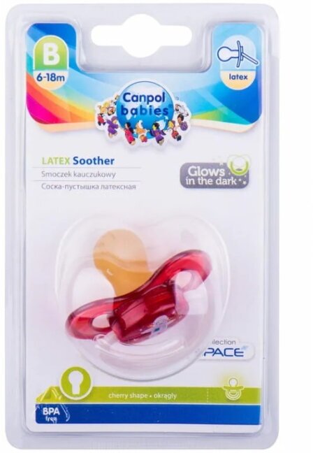 Пустышка Canpol Babies круглой формы изготовлена из высококачественного латекса. Пустышка хорошо вентилируемая. Ручка пустышки светиться в темноте, что очень удобно, если ее нужно найти ночью. Для детей от 6 до 18 месяцев.