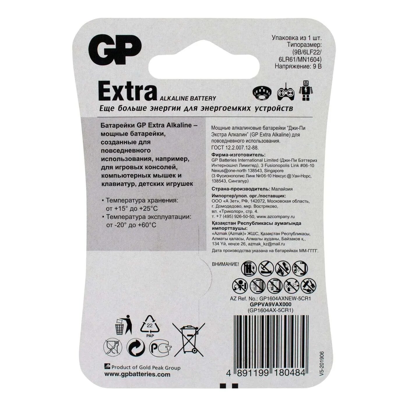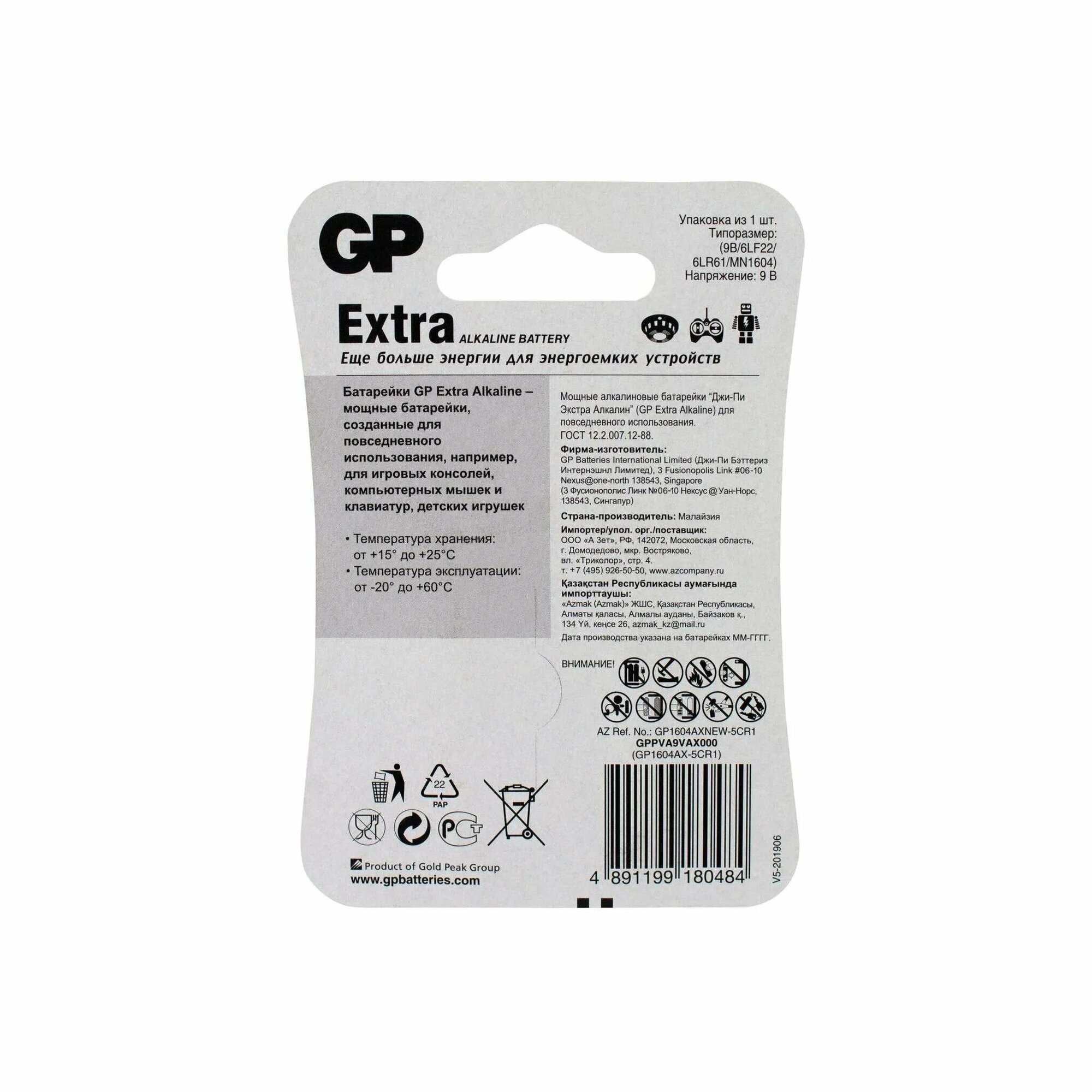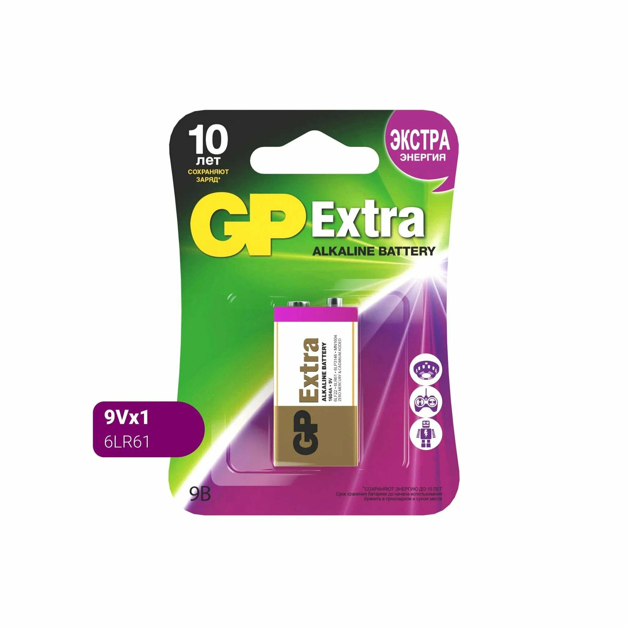 Батарея GP 1604AX New - cтандартная батарейка 9V Крона подходящая для использования в устройствах со средним и низким энергопотреблением. Не боится пониженного температурного режима и больших нагрузок. Срок хранения до 5 лет.