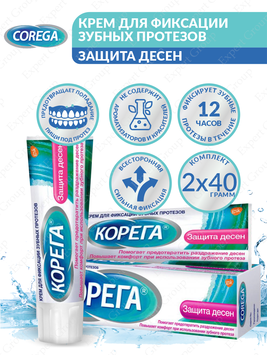 Крем для фиксации зубных протезов Корега Защита Десен повышает качество жизни людей, использующих зубные протезы.Основные преимущества:- Предотвращает попадение частичек пищи под протез*- Фиксирует протез в течение 12 часов**- Повышает комфорт при использовании съемных зубных протезов, защищает десны от натираний*GSK Study L3920658, Tyson-Johnson, D., Shanga, G. and Fernandez, P.(2010) The use of soluble denture adhesive to prevent food from becoming trapped under full upper and lower dentures, GSK. **Clark, G.E. Evaluation of the retentive properties of a Gantrez cream adhesive (formula 097-792), Gantrez cream pump adhesive formula (097-951) and current Super poliGrip. 28-08-1988.Diamond, M.W. Efficacy study of a denture adhesive to reduce denture dislodgement while eating corn onthe cob or apples. 26-12-1990.