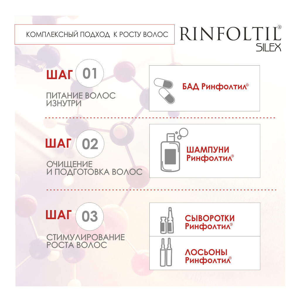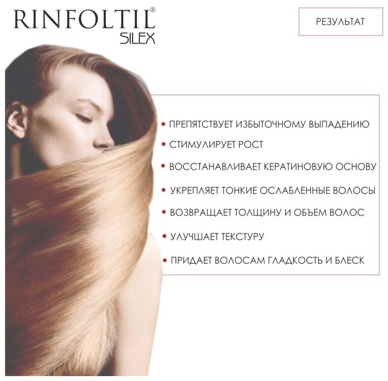 Новый инновационный Silex Complex с органическим кремнием поможет вдохнуть жизнь и вернуть красоту увядающим волосам. Эта уникальная формула является результатом 10-летних исследований. Часто видимая потеря волос вызвана не только выпадением. Слабые хрупкие волосы при расчесывании и укладке могут ломаться у основания или по всей длине, создавая видимость выпадения. Такие волосы нуждаются в радикальном укреплении, в котором поможет серия средств Ринфолтил Силекс. Кремний - важнейший компонент, необходимый для полноценного формирования кератина, из которого на 90% состоят волосы. Длинные молекулы кремния исполняют роль гибкого скелета, на котором держится кератин. Кремний отлично удерживает влагу, что придает толщину и естественный блеск волосам. При его недостатке волосы становятся тонкими, сухими и ломкими, начинают расслаиваться. Silex Complex с органическим кремнием профессионально подходит к проблеме сухих, тонких и ломких волос.
