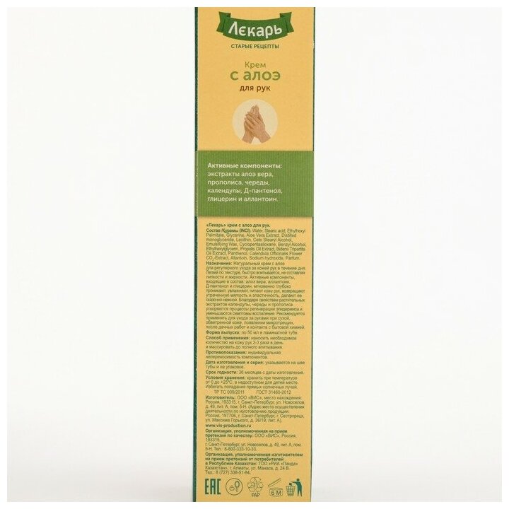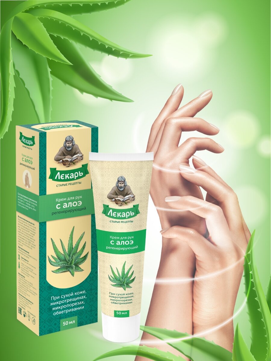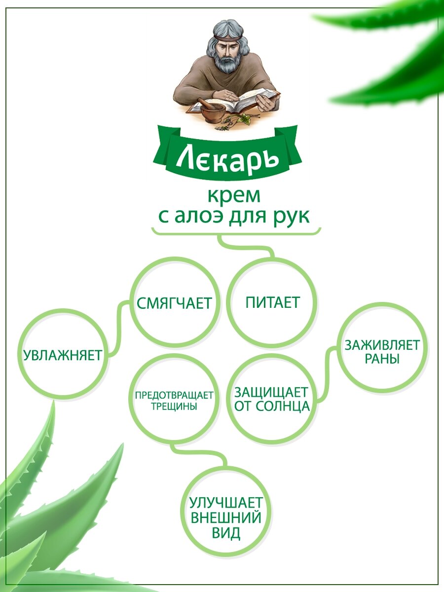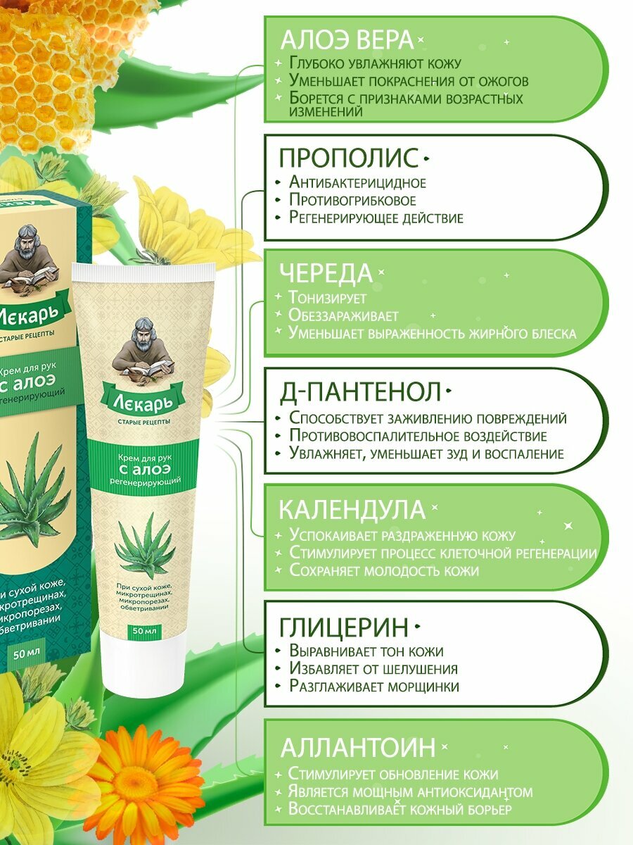 Натуральный восстанавливающий "Лекарь" крем с Алоэ для регулярного ухода за кожей рук в течение дня, от внешней агрессии и потери влаги. Активные компоненты крема входящие в состав: алоэ вера, аллантоин, д-пантенол, глицерин мгновенно глубоко проникают, увлажняют, питают кожу рук, возвращают утраченную мягкость и эластичность, делают ее нежной. Благодаря свойствам натуральных экстрактов календулы, прополиса, череды, уменьшаются симптомы воспаления, снижается зуд раздраженной кожи, ускоряются процессы регенерации эпидермиса. Рекомендуется применять для ухода за руками при сухой, обветренной коже, появлении микротрещин, после дачных работ и при контакте с бытовой химией. Алоэ вера экстракт - содержит гликопротеины и полисахариды, которые ускоряют заживление тканей и оказывают противовоспалительное действие. Ускоряет процессы регенерации, увеличивает синтез коллагена, имеет антиаллергический и бактерицидный эффект, тонизирует и увлажняет кожу. Прополис - смолистое вещество, производимое и используемое пчёлами для строительных целей и дезинфекции ячеек в улье. Обладает противомикробными, антиоксидантными, противовоспалительными свойствами. Череды экстракт - обладает ранозаживляющим и антиаллергическим действием, уменьшает отечность тканей, кожные проявления аллергии и зуд. Календулы экстракт - обладает сильно выраженными бактерицидными свойствами, применяется как ранозаживляющее, бактерицидное и противовоспалительное средство. Д-пантенол - стимулирует заживление и восстановление слоев кожи, нормализует клеточный обмен, усиливает прочность коллагеновых волокон. Обладает увлажняющим и разглаживающим кожу действием, повышает регенерацию клеток, ускоряет эпителизацию. Глицерин - смягчает и увляжняет кожу за счет высокой способности удерживать влагу, создает на коже защитный барьер. Аллантоин - смягчает, интенсивно увлажняет кожу, стимулирует обновление клеток эпидермиса. Обладает противовоспалительной и антиоксидантной активностью, успокаивает раздраженную кожу.