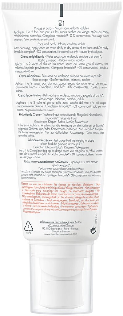 | Состав | avene thermale spring water (avene aqua), glycerin, mineral oil (paraffinum liquidum), cetearyl alcohol, oenothera biennis (evening primrose) oil (oenothera biennis oil), caprylic/capric triglyceride, ceteraryl glucoside, aquaphilus dolomiae extract, arginine, carbomer, evening primrose oil, palm oil aminopropanediol esters, glycine, sodium hydroxide, tocopherol, water (aqua) |