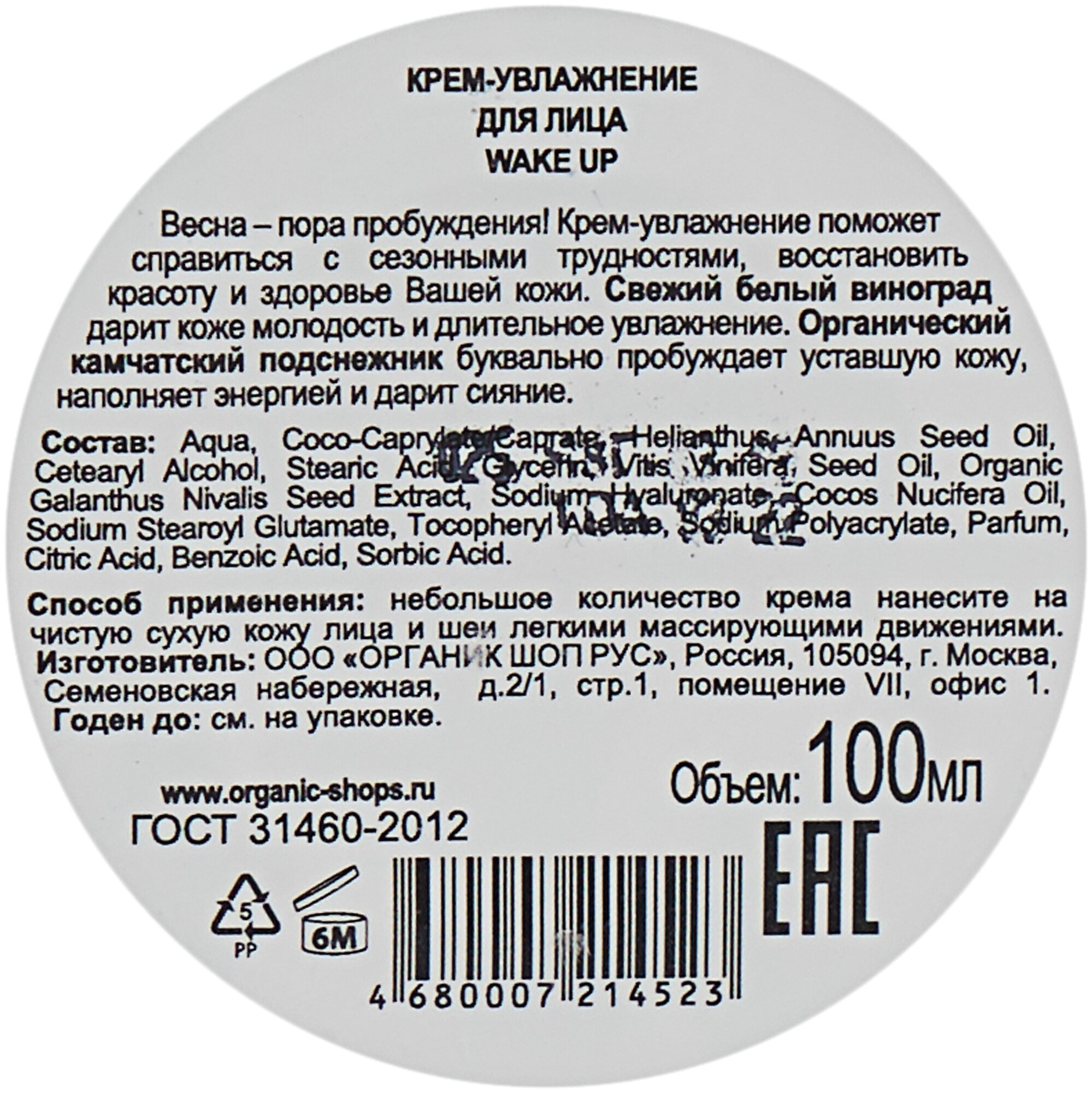 Крем-увлажнение Organic Kitchen (Органик китчен) для лица Wake up 100 мл ООО "Органик Шоп Рус" RU (579935)
