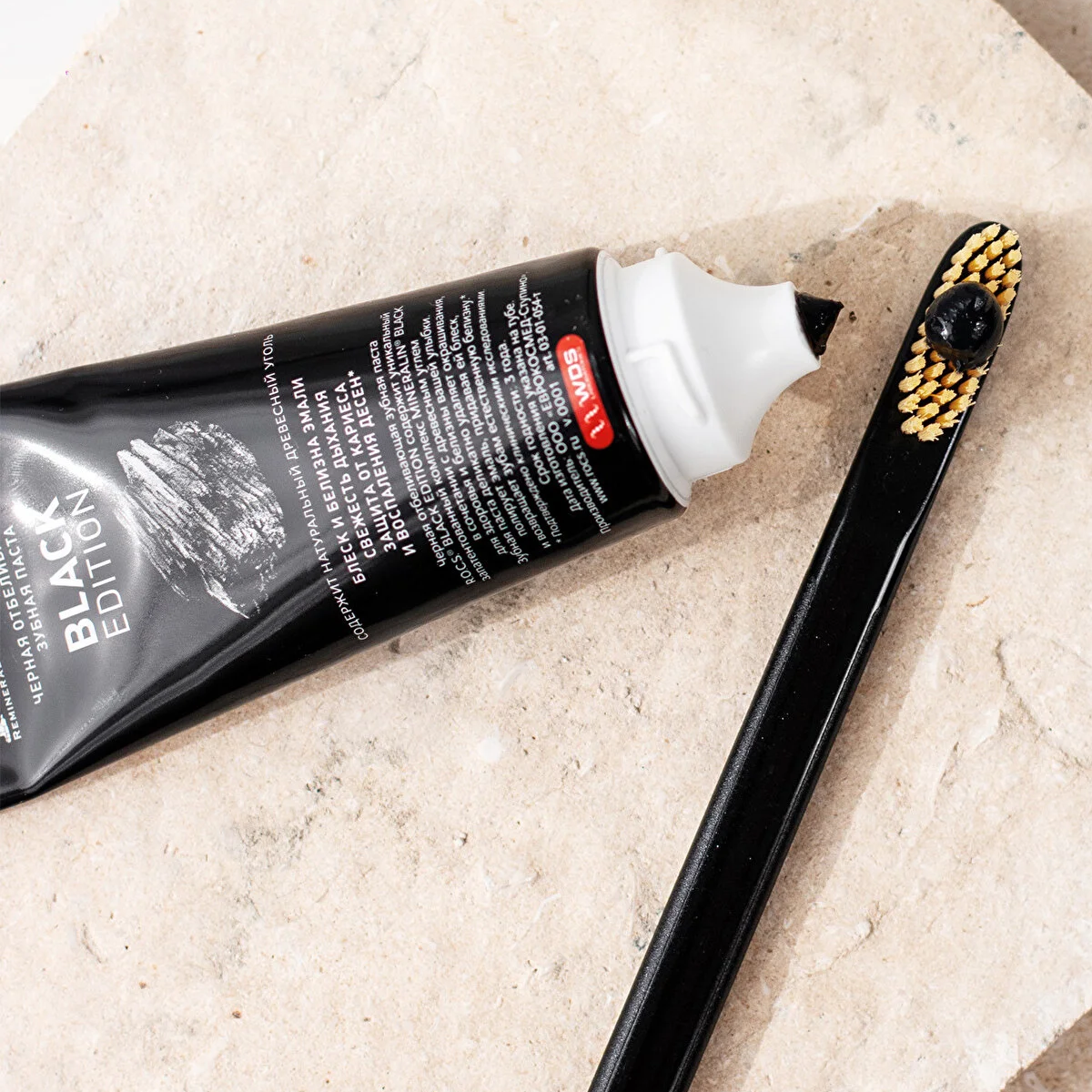 Черная отбеливающая зубная паста Rocs имеет уникальный запатентованный состав. Ее формула разработана на основе инновационной многоступенчатой системы очищения. Благодаря применению данной системы, паста содержит специальные очищающие и полирующие гранулы, которые на начальном этапе чистки зубов быстро, безопасно и качественно удаляют мягкий зубной налет. В завершении чистки, гранулы распадаются на более мелкие округлые частицы, полирующие эмаль и придающие ей блеск. Кроме этого, паста содержит комплекс Mineralin®, насыщающий твердые ткани зубов (эмаль, дентин) необходимыми микроэлементами (кальцием, магнием и фосфором). В результате регулярного использования Rocs "Black Edition" обеспечивается защита от основных стоматологических заболеваний, зубы становятся более крепкими, эмаль приобретает естественную белизну и блеск.