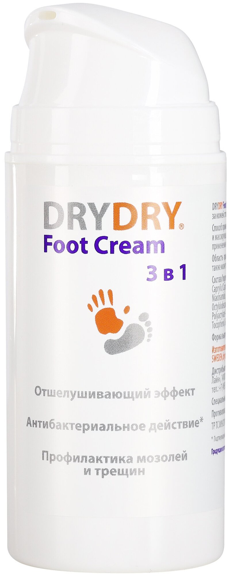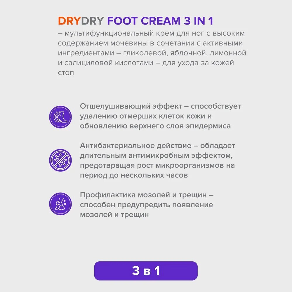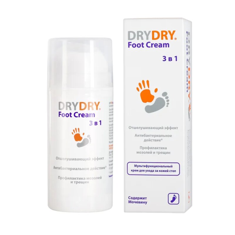 Уход за кожей - важная часть ухода за собой и своим телом как для женщин, так и для мужчин, а также и для подростков. Мультифункциональный крем для ног Foot Cream 3 in 1, 100 мл. Женский и мужской крем для ног с мочевиной способствует удалению отмерших клеток кожи, обладает длительным антимикробным эффектом и способен предупредить появление мозолей и трещин. Благодаря наличию гликолевой, яблочной, лимонной и салициловой кислот в составе крем для стоп обновляет верхний слой эпидермиса и предотвращает рост микроорганизмов на период до нескольких часов. Нанесите крем от трещин на чистую и сухую кожу ног и массирующими движениями распределите до полного впитывания. Увлажняющий крем следует применять один раз в день, предпочтительнее вечером, до достижения желаемого эффекта. При ежедневном применении средства состояние кожи будет заметно улучшаться. После достижения желаемого эффекта крем для сухой кожи ног можно наносить два раза в неделю в целях профилактики от пота или гипергидроза. Уходовая косметика DRY DRY (драй драй) применяется на сухую кожу ног, костные мозоли и пяточные трещины. Также может применяться в качестве заживляющего средства в случае наличия повреждений на коже стоп.