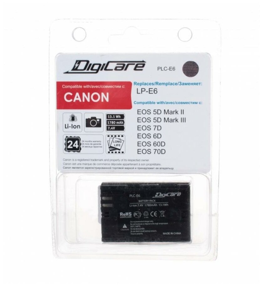 DigiCare (аналог Canon LP-E6) - современный, компактный и легкий аккумулятор, обеспечивающий фотоаппарат энергией длительное время в любых условиях. Этот литиевый аккумулятор обладает быстрым процессом зарядки и рассчитан на продолжительную работу. У него отсутствует эффект памяти, благодаря этому батарея восстанавливает работоспособность даже после глубокого разряда. Элемент питания является полноценной заменой оригинальной батарее камеры, а также отлично подойдет в качестве запасного для долгой съемки.