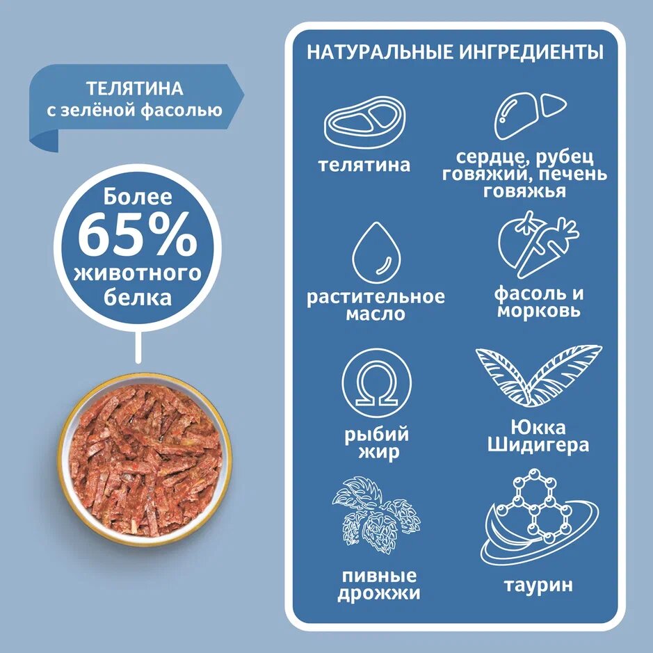 - телятина, сердце, рубец говяжий, печень говяжья, бульон говяжий, фасоль, морковь, масло растительное, желирующая добавка, рыбий жир, пивные дрожжи, морские водоросли, экстракт Юкка Шидигера.