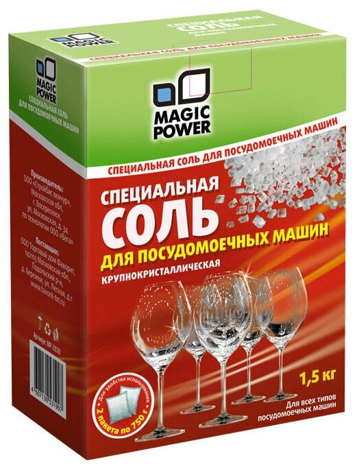 Специальная соль для посудомоечных машин Magic Power используется для нормального функционирования ионообменника во встроенном в посудомоечной машине устройстве смягчения воды. Увеличивает ресурс посудомоечной машины, обеспечивает ее нормальную работу.